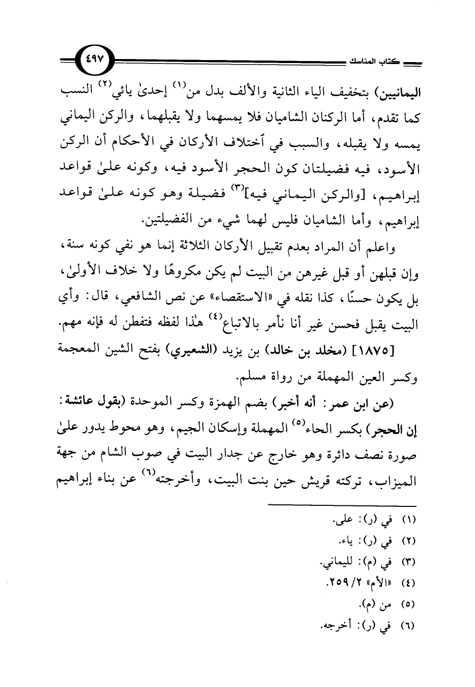 اليمانيين) بتخفيف الياء الثانية والألف بدل من (¬1) إحدى يائي (¬2) النسب كما تقدم، أما الركنان الشاميان فلا يمسهما ولا يقبلهما، والركن اليماني يمسه ولا يقبله، والسبب في اختلاف الأركان في الأحكام أن الركن الأسود، فيه فضيلتان كون الحجر الأسود فيه، وكونه على قواعد إبراهيم، [والركن اليماني فيه] (¬3) فضيلة وهو كونه على قواعد إبراهيم، وأما الشاميان فليس لهما شيء من الفضيلتين.
