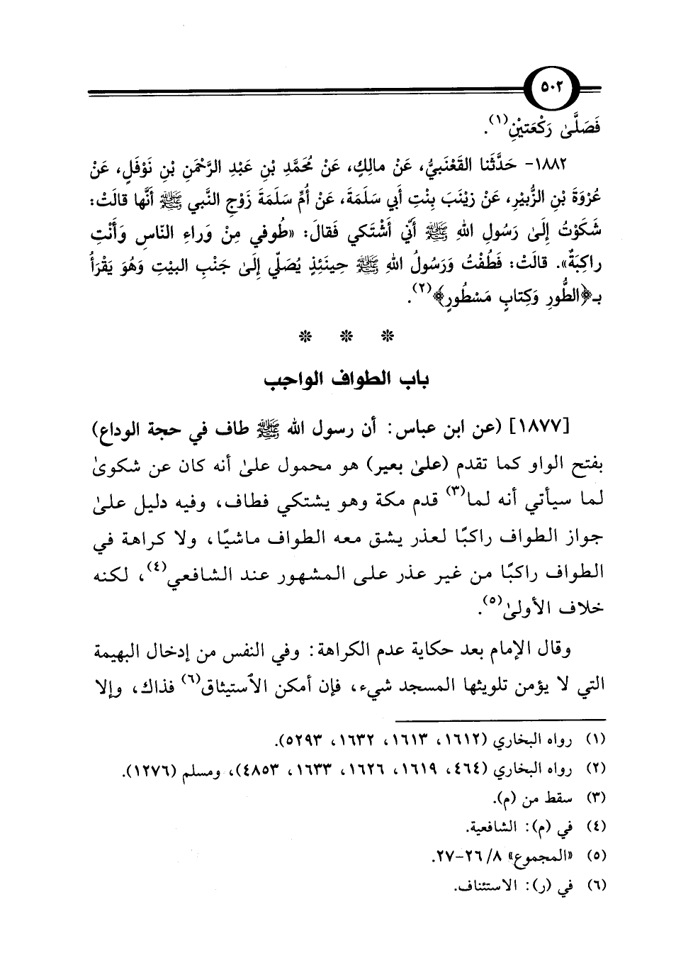 1882 - حَدَّثَنا القَعْنَبيُّ، عَنْ مالِكٍ، عَنْ مُحَمَّدِ بْنِ عَبْدِ الرَّحْمَنِ بْنِ نَوْفَلٍ، عَنْ عُرْوَةَ بْنِ الزُّبيْرِ، عَنْ زيْنَبَ بِنْتِ أَبي سَلَمَةَ، عَنْ أُمِّ سَلَمَةَ زَوْجِ النَّبي - صلى الله عليه وسلم - أنَّها قَالَتْ: شَكَوْتُ إِلَى رَسُولِ اللهِ - صلى الله عليه وسلم - أَنّي أَشْتَكي فَقَالَ: "طُوفي مِنْ وَراءِ النّاسِ وَأَنْتِ راكِبَةٌ". قَالَتْ: فَطُفْتُ وَرَسُولُ اللهِ - صلى الله عليه وسلم - حِينَئِذٍ يُصَلّي إِلَى جَنْبِ البيْتِ وَهُوَ يَقْرَأُ بـ {وَالطُّورِ (1) وَكِتَابٍ مَسْطُورٍ} (¬2).
