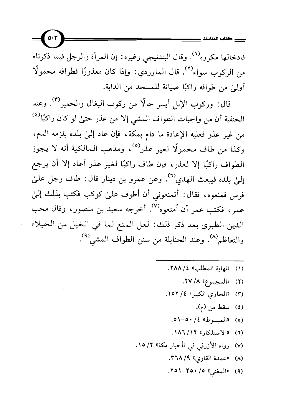 قال: وركوب الإبل أيسر حالًا من ركوب البغال والحمير (¬3). وعند الحنفية أن من واجبات الطواف المشي إلا من عذر حتى لو كان راكبًا (¬4) من غير عذر فعليه الإعادة ما دام بمكة، فإن عاد إلى بلده يلزمه الدم، وكذا من طاف محمولًا لغير عذر (¬5)، ومذهب المالكية أنه لا يجوز الطواف راكبًا إلا لعذر، فإن طاف راكبًا لغير عذر أعاد إلا أن يرجع إلى بلده فيبعث الهدي (¬6). وعن عمرو بن دينار قال: طاف رجل على فرس فمنعوه، فقال: أتمنعوني أن أطوف على كوكب فكتب بذلك إلى عمر، فكتب عمر أن امنعوه (¬7). أخرجه سعيد بن منصور، وقال محب الدين الطبري بعد ذكر ذلك: لعل المنع لما في الخيل من الخيلاء والتعاظم (¬8). وعند الحنابلة من سنن الطواف المشي (¬9).