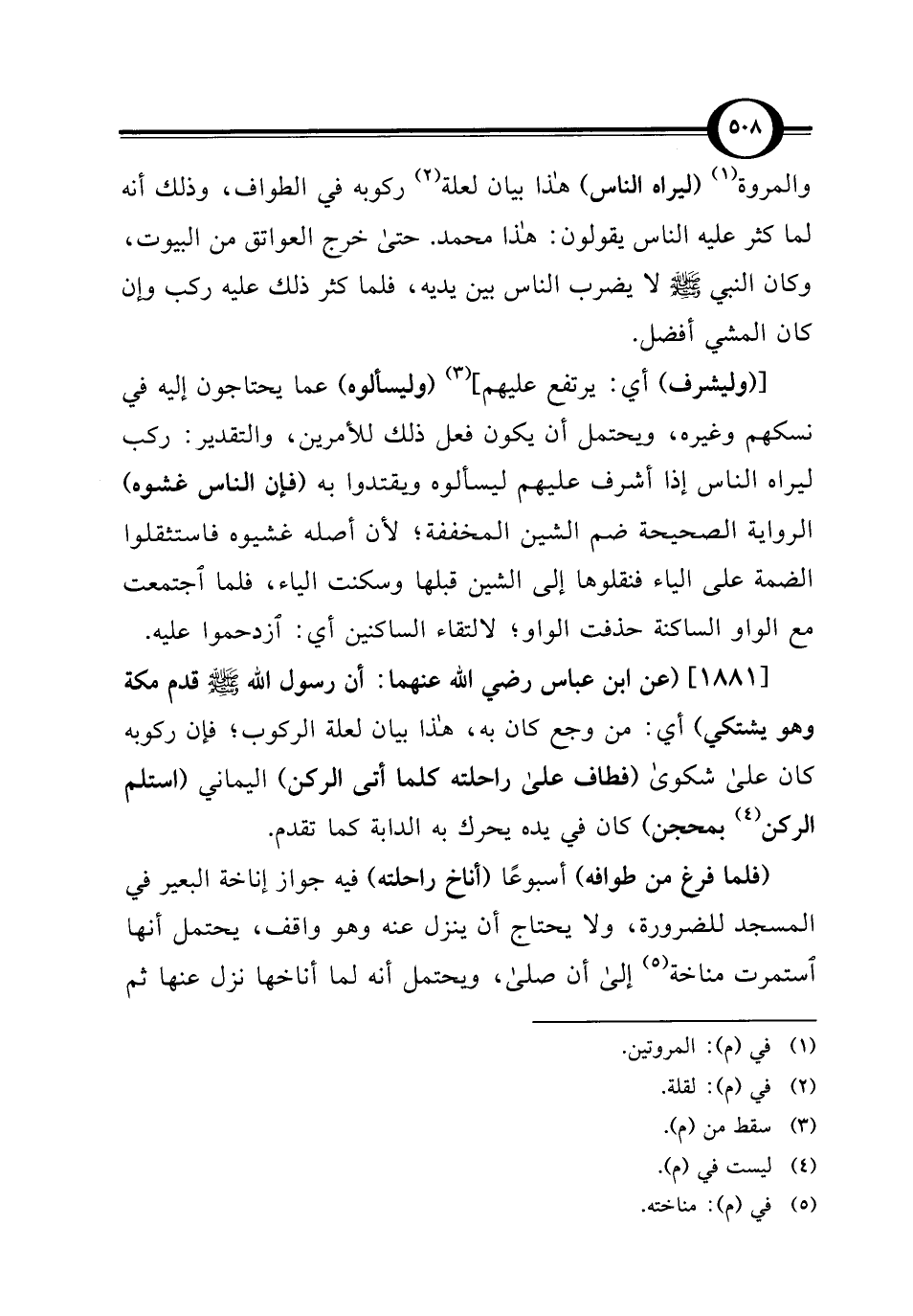 [1881] (عن ابن عباس رضي الله عنهما: أن رسول الله - صلى الله عليه وسلم - قدم مكة وهو يشتكي) أي: من وجع كان به، هذا بيان لعلة الركوب؛ فإن ركوبه كان على شكوى (فطاف على راحلته كلما أتى الركن) اليماني (استلم الركن (¬4) بمحجن) كان في يده يحرك به الدابة كما تقدم.