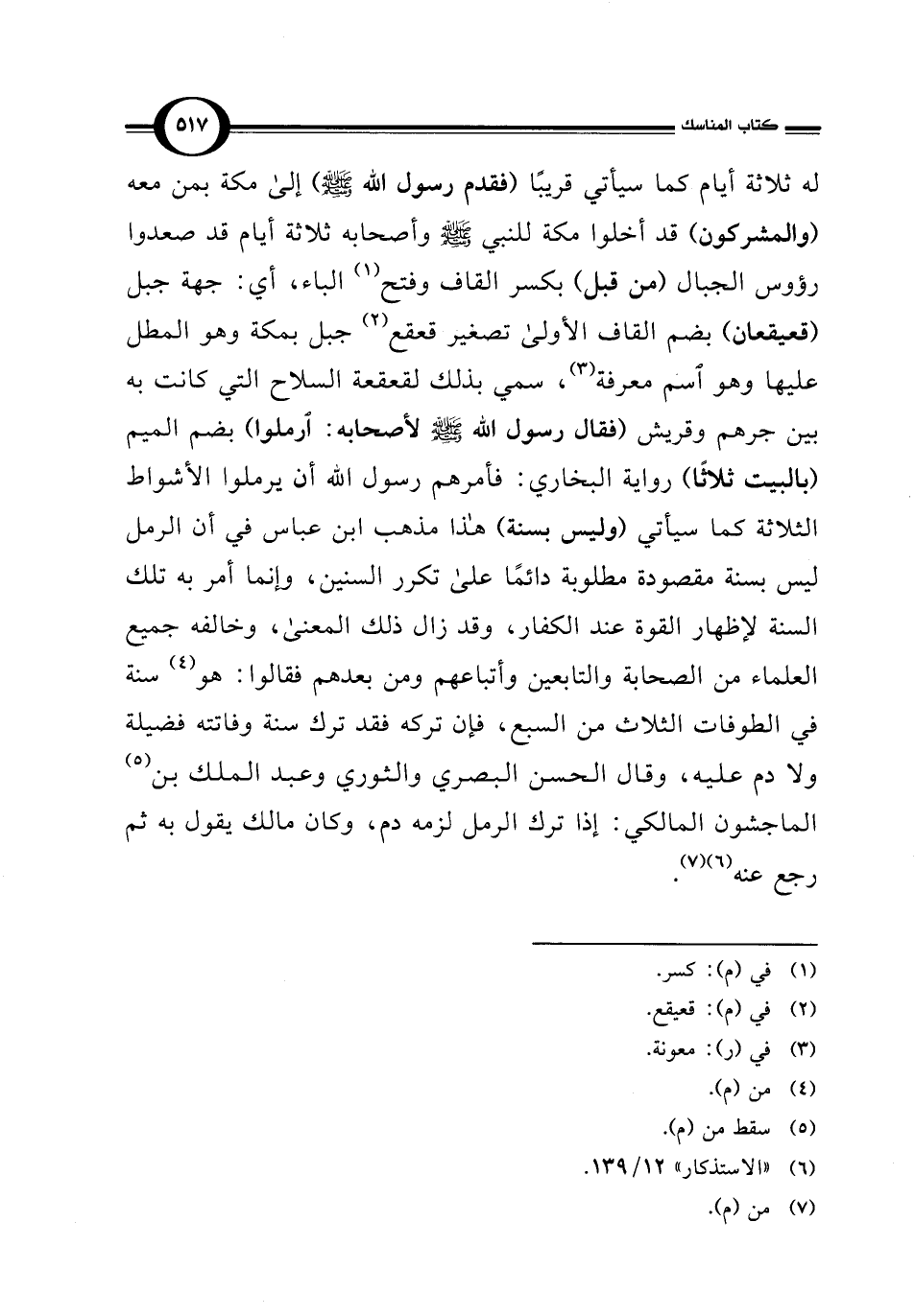 له ثلاثة أيام كما سيأتي قريبًا (فقدم رسول الله - صلى الله عليه وسلم -) إلى مكة بمن معه (والمشركون) قد أخلوا مكة للنبي - صلى الله عليه وسلم - وأصحابه ثلاثة أيام قد صعدوا رؤوس الجبال (من قبل) بكسر القاف وفتح (¬1) الباء، أي: جهة جبل (قعيقعان) بضم القاف الأولى تصغير قعقع (¬2) جبل بمكة وهو المطل عليها وهو اسم معرفة (¬3)، سمي بذلك لقعقعة السلاح التي كانت به بين جرهم وقريش (فقال رسول الله - صلى الله عليه وسلم - لأصحابه: ارملوا) بضم الميم (بالبيت ثلاثًا) رواية البخاري: فأمرهم رسول الله أن يرملوا الأشواط الثلاثة كما سيأتي (وليس بسنة) هذا مذهب ابن عباس في أن الرمل ليس بسنة مقصودة مطلوبة دائمًا على تكرر السنين، وإنما أمر به تلك السنة لإظهار القوة عند الكفار، وقد زال ذلك المعنى، وخالفه جميع العلماء من الصحابة والتابعين وأتباعهم ومن بعدهم فقالوا: هو (¬4) سنة في الطوفات الثلاث من السبع، فإن تركه فقد ترك سنة وفاتته فضيلة ولا دم عليه، وقال الحسن البصري والثوري وعبد الملك بن (¬5) الماجشون المالكي: إذا ترك الرمل لزمه دم، وكان مالك يقول به ثم رجع عنه (¬6) (¬7).