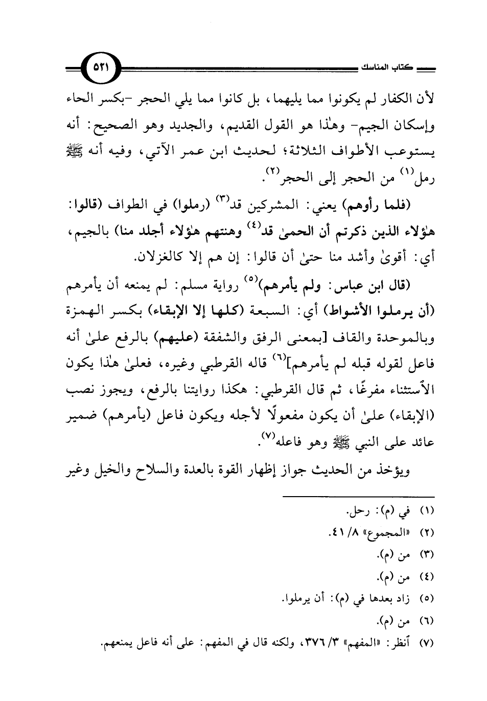 (قال ابن عباس: ولم يأمرهم) (¬5) رواية مسلم: لم يمنعه أن يأمرهم (أن يرملوا الأشواط) أي: السبعة (كلها إلا الإبقاء) بكسر الهمزة وبالموحدة والقاف [بمعنى الرفق والشفقة (عليهم) بالرفع على أنه فاعل لقوله قبله لم يأمرهم] (¬6) قاله القرطبي وغيره، فعلى هذا يكون الاستثناء مفرغًا، ثم قال القرطبي: هكذا روايتنا بالرفع، ويجوز نصب (الإبقاء) على أن يكون مفعولًا لأجله ويكون فاعل (يأمرهم) ضمير عائد على النبي - صلى الله عليه وسلم - وهو فاعله (¬7).