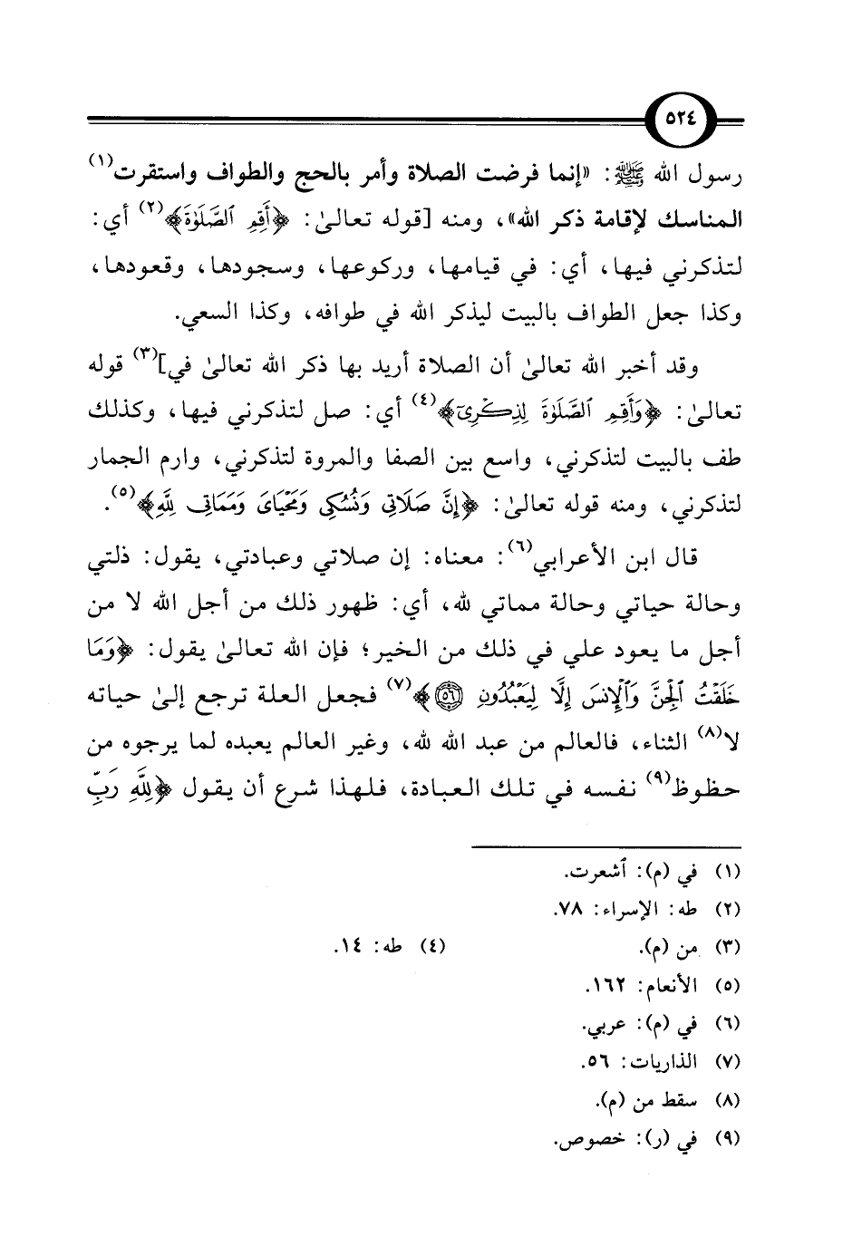 وقد أخبر الله تعالى أن الصلاة أريد بها ذكر الله تعالى في] (¬3) قوله تعالى: {وَأَقِمِ الصَّلَاةَ لِذِكْرِي} (¬4) أي: صل لتذكرني فيها، وكذلك طف بالبيت لتذكرني، واسع بين الصفا والمروة لتذكرني، وارم الجمار لتذكرني، ومنه قوله تعالى: {إِنَّ صَلَاتِي وَنُسُكِي وَمَحْيَايَ وَمَمَاتِي لِلَّهِ} (¬5).