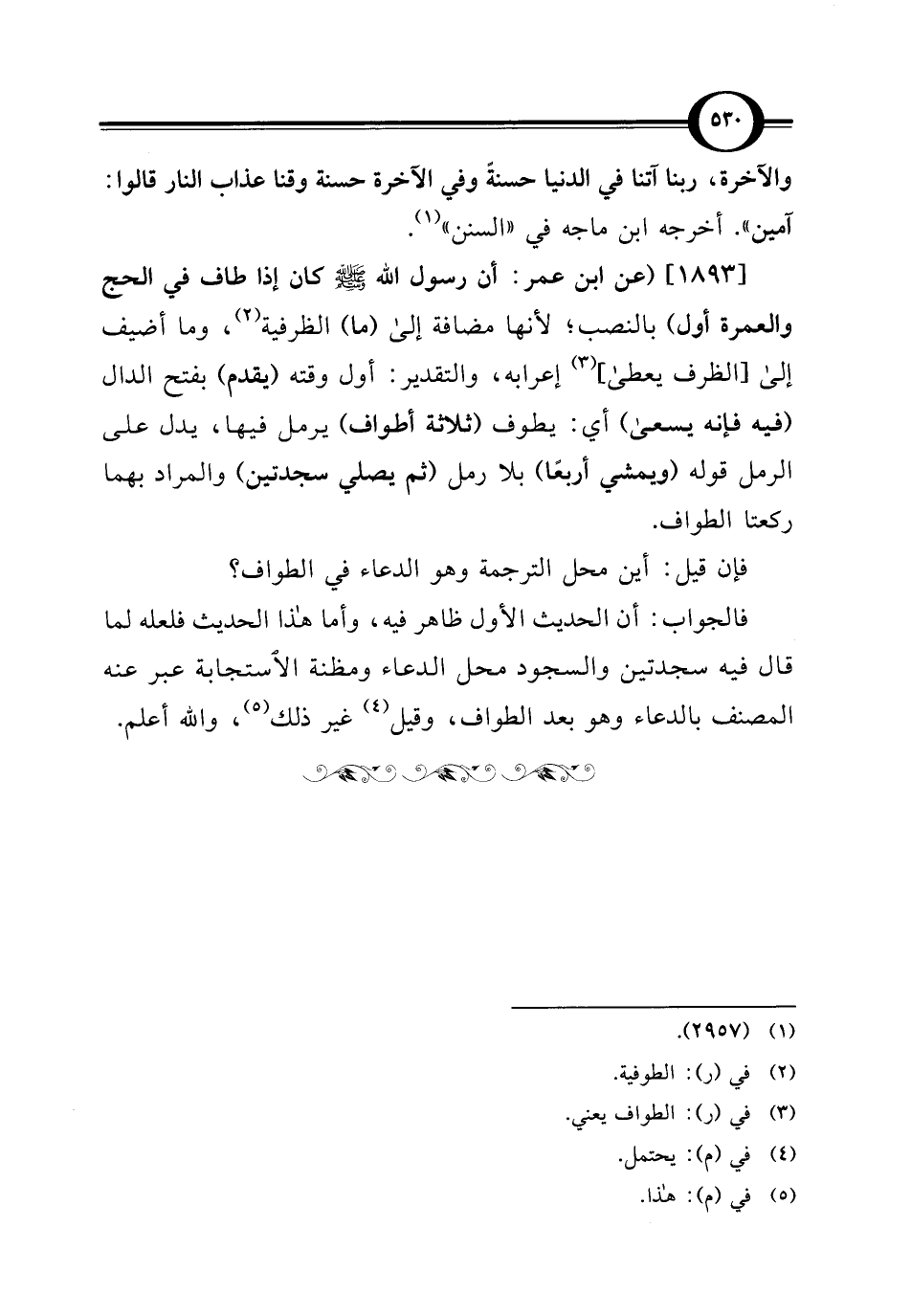 [1893] (عن ابن عمر: أن رسول الله - صلى الله عليه وسلم - كان إذا طاف في الحج والعمرة أول) بالنصب؛ لأنها مضافة إلى (ما) الظرفية (¬2)، وما أضيف إلى [الظرف يعطى] (¬3) إعرابه، والتقدير: أول وقته (يقدم) بفتح الدال (فيه فإنه يسعى) أي: يطوف (ثلاثة أطواف) يرمل فيها، يدل على الرمل قوله (ويمشي أربعًا) بلا رمل (ثم يصلي سجدتين) والمراد بهما ركعتا الطواف.
