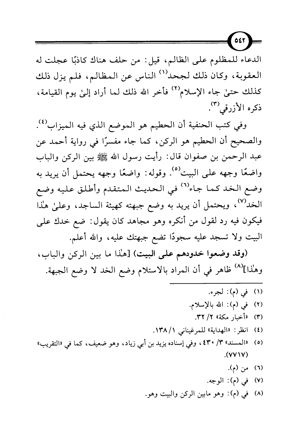 وفي كتب الحنفية أن الحطيم هو الموضع الذي فيه الميزاب (¬4). والصحيح أن الحطيم هو الركن، كما جاء مفسرًا في رواية أحمد عن عبد الرحمن بن صفوان قال: رأيت رسول الله - صلى الله عليه وسلم - بين الركن والباب واضعًا وجهه على البيت (¬5). وقوله: واضعًا وجهه يحتمل أن يريد به وضع الخد كما جاء (¬6) في الحديث المتقدم وأطلق عليه وضع الخد (¬7)، ويحتمل أن يريد به وضع جبهته كهيئة الساجد، وعلى هذا فيكون فيه رد لقول من أنكره وهو مجاهد كان يقول: ضع خدك على البيت ولا تسجد عليه سجودًا تضع جبهتك عليه، والله أعلم.