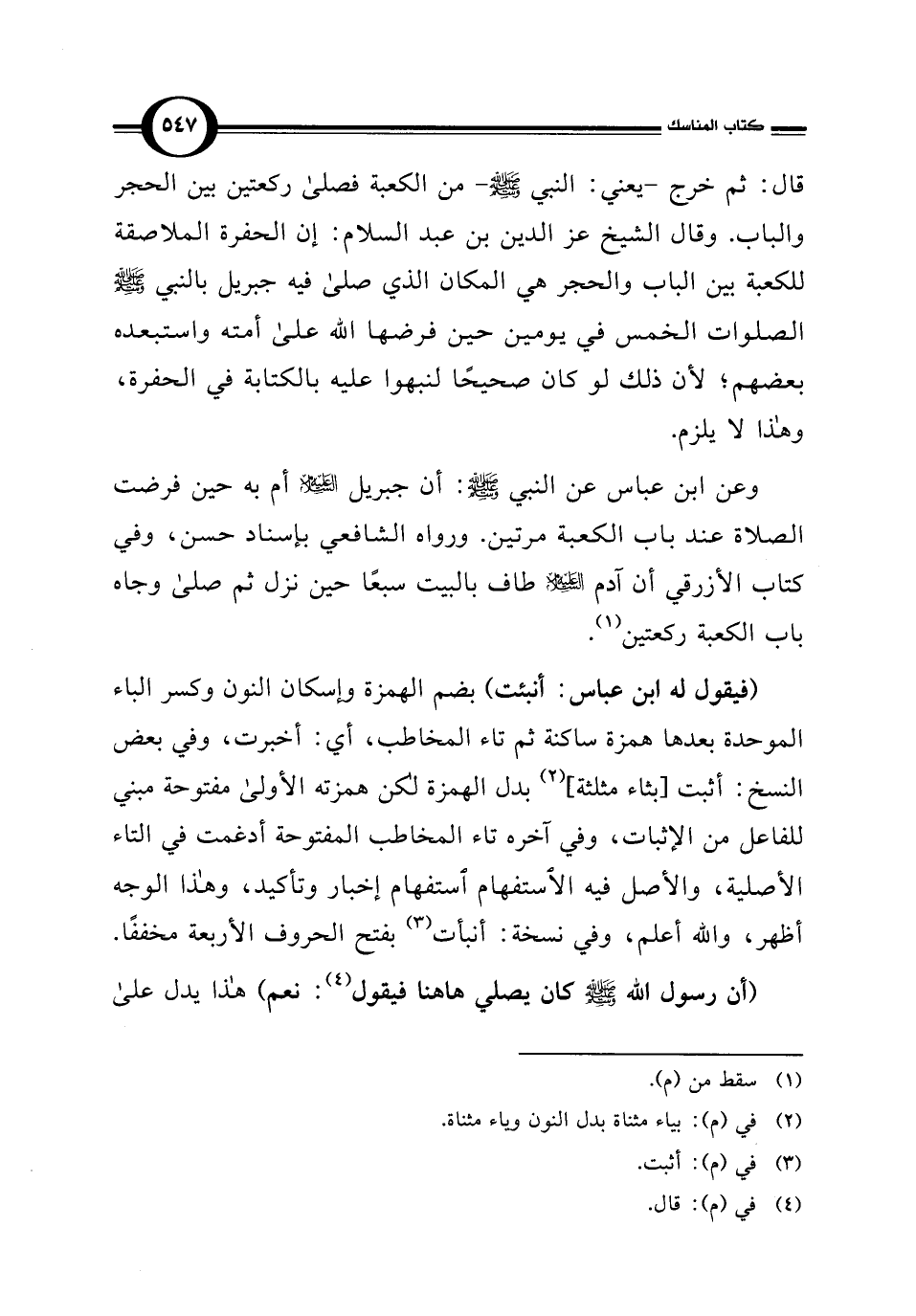 قال: ثم خرج - يعني: النبي - صلى الله عليه وسلم - من الكعبة فصلى ركعتين بين الحجر والباب. وقال الشيخ عز الدين بن عبد السلام: إن الحفرة الملاصقة للكعبة بين الباب والحجر هي المكان الذي صلى فيه جبريل بالنبي - صلى الله عليه وسلم - الصلوات الخمس في يومين حين فرضها الله على أمته واستبعده بعضهم؛ لأن ذلك لو كان صحيحًا لنبهوا عليه بالكتابة في الحفرة، وهذا لا يلزم.