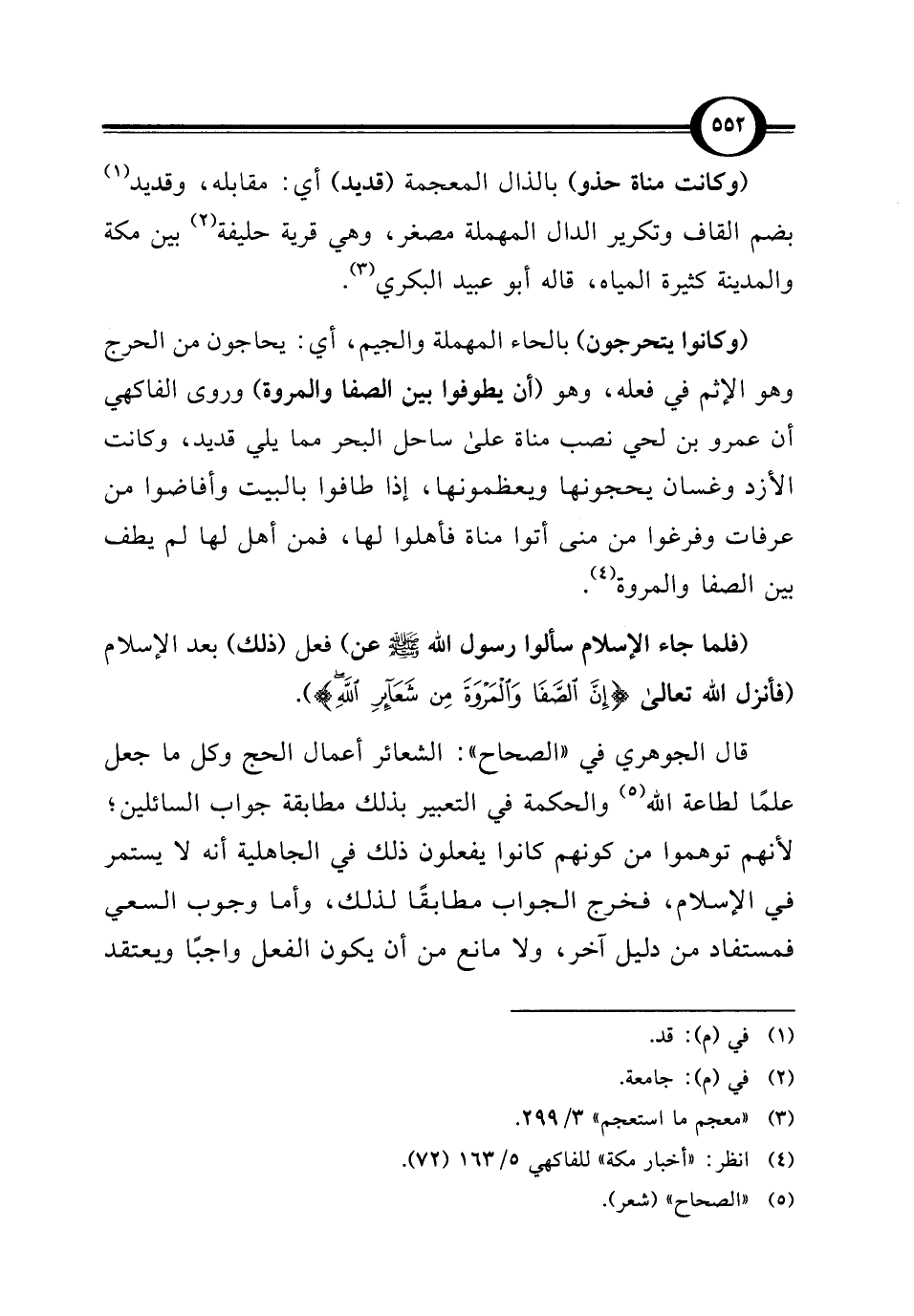 (وكانوا يتحرجون) بالحاء المهملة والجيم، أي: يحاجون من الحرج وهو الإثم في فعله، وهو (أن يطوفوا بين الصفا والمروة) وروى الفاكهي أن عمرو بن لحي نصب مناة على ساحل البحر مما يلي قديد، وكانت الأزد وغسان يحجونها ويعظمونها، إذا طافوا بالبيت وأفاضوا من عرفات وفرغوا من منى أتوا مناة فأهلوا لها، فمن أهل لها لم يطف بين الصفا والمروة (¬4).