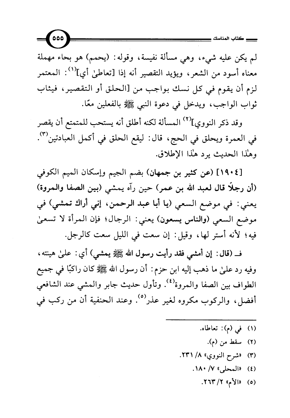 فـ (قال: إن أمشي فقد رأيت رسول الله - صلى الله عليه وسلم - يمشي) أي: على هينته، وفيه رد على ما ذهب إليه ابن حزم: أن رسول الله - صلى الله عليه وسلم - كان راكبًا في جميع الطواف بين الصفا والمروة (¬4). وتأول حديث جابر والمشي عند الشافعي أفضل، والركوب مكروه لغير عذر (¬5). وعند الحنفية أن من ركب في