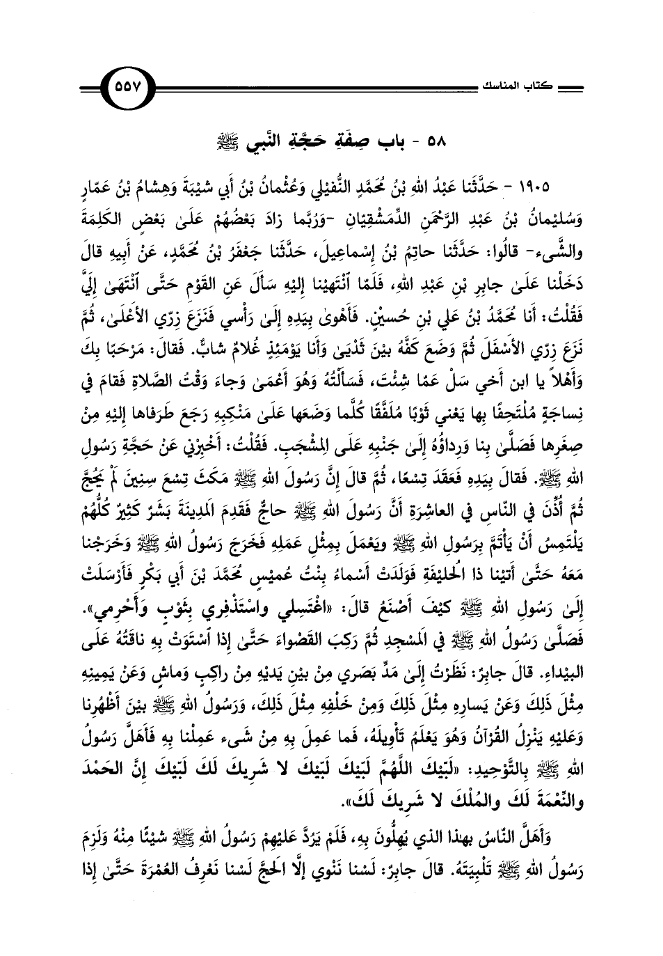 1905 - حَدَّثَنا عَبْدُ اللهِ بْنُ مُحَمَّدٍ النُّفيْلي وَعُثْمانُ بْنُ أَبي شَيْبَةَ وَهِشامُ بْنُ عَمّارٍ وَسُليْمانُ بْنُ عَبْدِ الرَّحْمَنِ الدِّمَشْقِيّانِ - وَرُبَّما زادَ بَعْضُهُمْ عَلَى بَعْضٍ الكَلِمَةَ والشَّيء - قَالُوا: حَدَّثَنا حاتِمُ بْنُ إِسْماعِيلَ، حَدَّثَنا جَعْفَرُ بْنُ مُحَمَّدٍ، عَنْ أَبِيهِ قَالَ دَخَلْنا عَلَى جابِرِ بْنِ عَبْدِ اللهِ، فَلَمّا انْتَهيْنا إِليْهِ سَأَلَ عَنِ القَوْمِ حَتَّى انْتَهَى إِلَيَّ فَقُلْتُ: أَنا مُحَمَّدُ بْنُ عَلي بْنِ حُسيْنٍ. فَأَهْوى بِيَدِهِ إِلَى رَأْسي فَنَزَعَ زِرّي الأَعْلَى، ثُمَّ نَزَعَ زِرّي الأَسْفَلَ ثُمَّ وَضَعَ كَفَّهُ بيْنَ ثَدْيَى وَأَنَا يَوْمَئِذٍ غُلامٌ شابٌّ. فَقَالَ: مَرْحَبًا بِكَ وَأَهْلًا يا ابن أَخي سَلْ عَمّا شِئْتَ، فَسَأَلْتُهُ وَهُوَ أَعْمَى وَجاءَ وَقْتُ الصَّلاةِ فَقَامَ في نِساجَةٍ مُلْتَحِفًا بِها يَعْني ثَوْبًا مُلَفَّقًا كُلَّما وَضَعَها عَلَى مَنْكِبِهِ رَجَعَ طَرَفاها إِليْهِ مِنْ صِغَرِها فَصَلَّى بِنا وَرِداؤُهُ إِلَى جَنْبِهِ عَلَى المِشْجَبِ. فَقُلْتُ: أَخْبِرْنِي عَنْ حَجَّةِ رَسُولِ اللهِ - صلى الله عليه وسلم -. فَقَالَ بِيَدِهِ فَعَقَدَ تِسْعًا، ثُمَّ قَالَ إِنَّ رَسُولَ اللهِ - صلى الله عليه وسلم - مَكَثَ تِسْعَ سِنِينَ لَمْ يَحُجَّ ثُمَّ أُذِّنَ في النّاسِ في العاشِرَةِ أَنَّ رَسُولَ اللهِ - صلى الله عليه وسلم - حاجٌّ فَقَدِمَ المَدِينَةَ بَشَرٌ كَثِيرٌ كُلُّهُمْ يَلْتَمِسُ أَنْ يَأْتَمَّ بِرَسُولِ اللهِ - صلى الله عليه وسلم - ويَعْمَلَ بِمِثْلِ عَمَلِهِ فَخَرَجَ رَسُولُ اللهِ - صلى الله عليه وسلم - وَخَرَجْنا مَعَهُ حَتَّى أَتيْنا ذا الحُليْفَةِ فَوَلَدَتْ أَسْماء بِنْتُ عُميْسٍ مُحَمَّدَ بْنَ أَبي بَكْرٍ فَأَرْسَلَتْ إِلَى رَسُولِ اللهِ - صلى الله عليه وسلم - كَيْفَ أَصْنَعُ قَالَ: "اغْتَسِلي واستَذْفِري بِثَوْبٍ وَأَحْرِمي". فَصَلَّى رَسُولُ اللهِ - صلى الله عليه وسلم - في المَسْجِدِ ثُمَّ رَكِبَ القَصْواءَ حَتَّى إِذا اسْتَوَتْ بِهِ ناقَتُهُ عَلَى البيْداءِ. قَالَ جابِرٌ: نَظَرْتُ إِلَى مَدِّ بَصَري مِنْ بيْنِ يَديْهِ مِنْ راكِبٍ وَماشٍ وَعَنْ يَمِينِهِ مِثْلَ ذَلِكَ وَعَنْ يَسارِهِ مِثْلَ ذَلِكَ وَمِنْ خَلْفِهِ مِثْلَ ذَلِكَ، وَرَسُولُ اللهِ - صلى الله عليه وسلم - بَيْنَ أَظْهُرِنا وَعَليْهِ يَنْزِلُ القُرْآنُ وَهُوَ يَعْلَمُ تَأْوِيلَهُ، فَما عَمِلَ بِهِ مِنْ شَيء عَمِلْنا بِهِ فَأَهَلَّ رَسُولُ اللهِ - صلى الله عليه وسلم - بِالتَّوْحِيدِ: "لَبّيْكَ اللَّهُمَّ لَبّيْكَ لَبّيْكَ لا شَرِيكَ لَكَ لَبّيْكَ إِنَّ الحَمْدَ والنِّعْمَةَ لَكَ والمُلْكَ لا شَرِيكَ لَكَ".