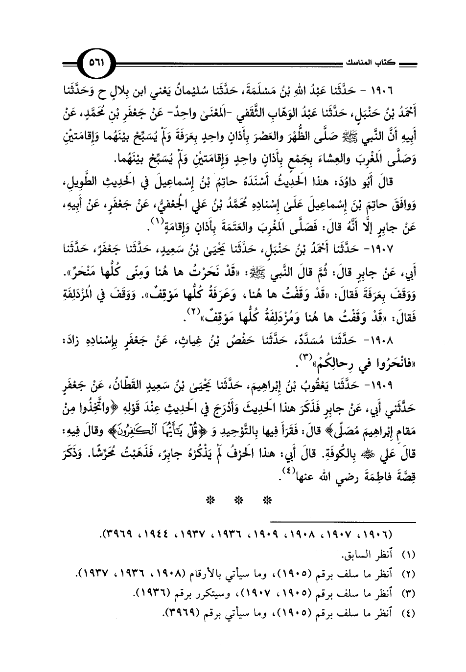 1909 - حَدَّثَنا يَعْقُوبُ بْنُ إِبْراهِيمَ، حَدَّثَنا يَحْيَى بْنُ سَعِيدٍ القَطّانُ، عَنْ جَعْفَرٍ حَدَّثَني أَبي، عَنْ جابِرٍ فَذَكَرَ هذا الحَدِيثَ وَأَدْرَجَ في الحَدِيثِ عِنْدَ قَوْلِهِ {وَاتَّخِذُوا مِنْ مَقَامِ إِبْرَاهِيمَ مُصَلًّى} قَالَ: فَقَرَأَ فِيها بِالتَّوْحِيدِ وَ {قُلْ يَاأَيُّهَا الْكَافِرُونَ} وقَالَ فِيهِ: قَالَ عَلي - رضي الله عنه - بِالكُوفَةِ. قَالَ أَبي: هذا الحَرْفُ لَمْ يَذْكُرْهُ جابِرٌ، فَذَهَبْتُ مُحَرِّشًا. وَذَكَرَ قِصَّةَ فاطِمَةَ رضي الله عنها (¬4).