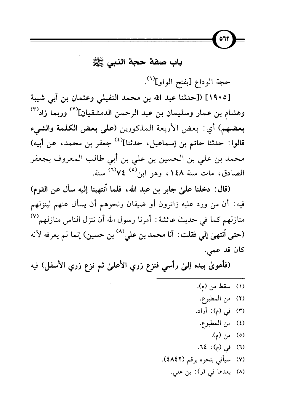 [1905] ([حدثنا عبد الله بن محمد النفيلي وعثمان بن أبي شيبة وهشام بن عمار وسليمان بن عبد الرحمن الدمشقيان] (¬2) وربما زاد (¬3) بعضهم) أي: بعض الأربعة المذكورين (على بعض الكلمة والشيء قالوا: حدثنا حاتم بن إسماعيل، حدثنا] (¬4) جعفر بن محمد، عن أبيه) محمد بن علي بن الحسين بن علي بن أبي طالب المعروف بجعفر الصادق، مات سنة 148، وهو ابن (¬5) 74 (¬6) سنة.