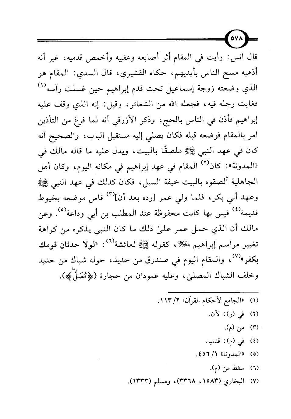 قال أنس: رأيت في المقام أثر أصابعه وعقبيه وأخمص قدميه، غير أنه أذهبه مسح الناس بأيديهم، حكاه القشيري، قال السدي: المقام هو الذي وضعته زوجة إسماعيل تحت قدم إبراهيم حين غسلت رأسه (¬1) فغابت رجله فيه، فجعله الله من الشعائر، وقيل: إنه الذي وقف عليه إبراهيم فأذن في الناس بالحج، وذكر الأزرقي أنه لما فرغ من التأذين أمر بالمقام فوضعه قبله فكان يصلي إليه مستقبل الباب، والصحيح أنه كان في عهد النبي - صلى الله عليه وسلم - ملصقًا بالبيت، ويدل عليه ما قاله مالك في "المدونة": كان (¬2) المقام في عهد إبراهيم في مكانه اليوم، وكان أهل الجاهلية ألصقوه بالبيت خيفة السيل، فكان كذلك في عهد النبي - صلى الله عليه وسلم - وعهد أبي بكر، فلما ولي عمر [رده بعد أن] (¬3) قاس موضعه بخيوط قديمة (¬4) قيس بها كانت محفوظة عند المطلب بن أبي وداعة (¬5). وعن مالك أن الذي حمل عمر على ذلك ما كان النبي يذكره من كراهة تغيير مراسم إبراهيم - عليه السلام -، كقوله - صلى الله عليه وسلم - لعائشة (¬6): "لولا حدثان قومك بكفر" (¬7)، والمقام اليوم في صندوق من حديد، حوله شباك من حديد وخلف الشباك المصلى، وعليه عمودان من حجارة ({مُصَلًّى}).