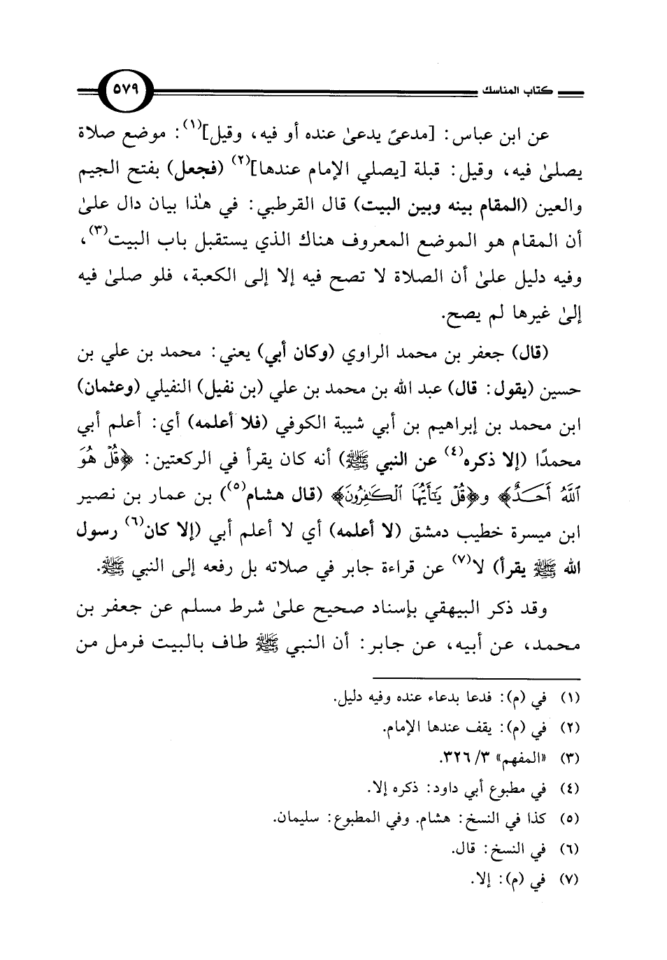 عن ابن عباس: [مدعًى يدعى عنده أو فيه، وقيل] (¬1): موضع صلاة يصلى فيه، وقيل: قبلة [يصلي الإمام عندها] (¬2) (فجعل) بفتح الجيم والعين (المقام بينه وبين البيت) قال القرطبي: في هذا بيان دال على أن المقام هو الموضع المعروف هناك الذي يستقبل باب البيت (¬3)، وفيه دليل على أن الصلاة لا تصح فيه إلا إلى الكعبة، فلو صلى فيه إلى غيرها لم يصح.