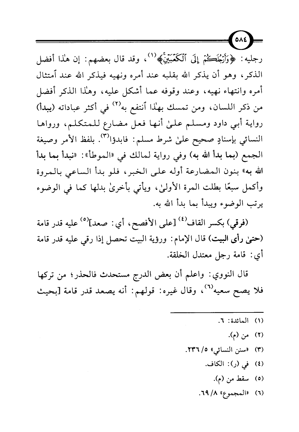 رجليه: {وَأَرْجُلَكُمْ إِلَى الْكَعْبَيْنِ} (¬1)، وقد قال بعضهم: إن هذا أفضل الذكر، وهو أن يذكر الله بقلبه عند أمره ونهيه فيذكر الله عند امتثال أمره وانتهاء نهيه، وعند وقوفه عما أشكل عليه، وهذا الذكر أفضل من ذكر اللسان، ومن تمسك بهذا انتفع به (¬2) في أكثر عباداته (يبدأ) رواية أبي داود ومسلم على أنها فعل مضارع للمتكلم، ورواها النسائي بإسنادٍ صحيح على شرط مسلم: فابدؤا (¬3). بلفظ الأمر وصيغة الجمع (بما بدأ الله به) وفي رواية لمالك في "الموطأ": "نبدأ بما بدأ الله به" بنون المضارعة أوله على الخبر، فلو بدأ الساعي بالمروة وأكمل سبعًا بطلت المرة الأولى، ويأتي بأخرى بدلها كما في الوضوء يرتب الوضوء ويبدأ بما بدأ الله به.