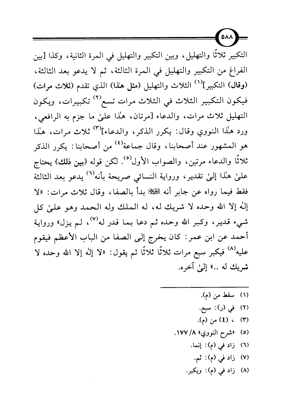 التكبير ثلاثًا والتهليل، وبين التكبير والتهليل في المرة الثانية، وكذا [بين الفراغ من التكبير والتهليل في المرة الثالثة، ثم لا يدعو بعد الثالثة، (وقال) التكبير] (¬1) الثلاث والتهليل (مثل هذا) الذي تقدم (ثلاث مرات) فيكون التكبير الثلاث في الثلاث مرات تسع (¬2) تكبيرات، ويكون التهليل ثلاث مرات، والدعاء [مرتان، هذا على ما جزم به الرافعي، ورد هذا النووي وقال: يكرر الذكر، والدعاء] (¬3) ثلاث مرات، هذا هو المشهور عند أصحابنا، وقال جماعة (¬4) من أصحابنا: يكرر الذكر ثلاثًا والدعاء مرتين، والصواب الأول (¬5). لكن قوله (بين ذلك) يحتاج على هذا إلى تقدير، ورواية النسائي صريحة بأنه (¬6) يدعو بعد الثالثة فقط فيما رواه عن جابر أنه - عليه السلام - بدأ بالصفا، وقال ثلاث مرات: "لا إله إلا الله وحده لا شريك له، له الملك وله الحمد وهو على كل شيء قدير، وكبر الله وحده ثم دعا بما قدر له (¬7)، لم يزل" ورواية أحمد عن ابن عمر: كان يخرج إلى الصفا من الباب الأعظم فيقوم عليه (¬8) فيكبر سبع مرات ثلاثًا ثلاثًا ثم يقول: "لا إله إلا الله وحده لا شريك له. ." إلى آخره.