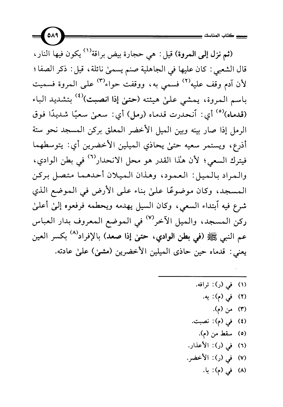 (ثم نزل إلى المروة) قيل: هي حجارة بيض براقة (¬1) يكون فيها النار، قال الشعبي: كان عليها في الجاهلية صنم يسمى نائلة، قيل: ذكر الصفا؛ لأن آدم وقف عليه (¬2) فسمي به، ووقفت حواء (¬3) على المروة فسميت باسم المروة، يمشي على هيئته (حتى إذا انصبت) (¬4) بتشديد الباء (قدماه) (¬5) أي: انحدرت قدماه (رمل) أي: سعى سعيًا شديدًا فوق الرمل إذا صار بينه وبين الميل الأخضر المعلق بركن المسجد نحو ستة أذرع، ويستمر سعيه حتى يحاذي الميلين الأخضرين أي: يتوسطهما فيترك السعي؛ لأن هذا القدر هو محل الانحدار (¬6) في بطن الوادي، والمراد بالميل: العمود، وهذان الميلان أحدهما متصل بركن المسجد، وكان موضوعًا على بناء على الأرض في الموضع الذي شرع فيه ابتداء السعي، وكان السيل يهدمه ويحطمه فرفعوه إلى أعلى ركن المسجد، والميل الآخر (¬7) في الموضع المعروف بدار العباس عم النبي - صلى الله عليه وسلم - (في بطن الوادي، حتى إذا صعد) بالإفراد (¬8) بكسر العين يعني: قدماه حين حاذى الميلين الأخضرين (مشى) على عادته.