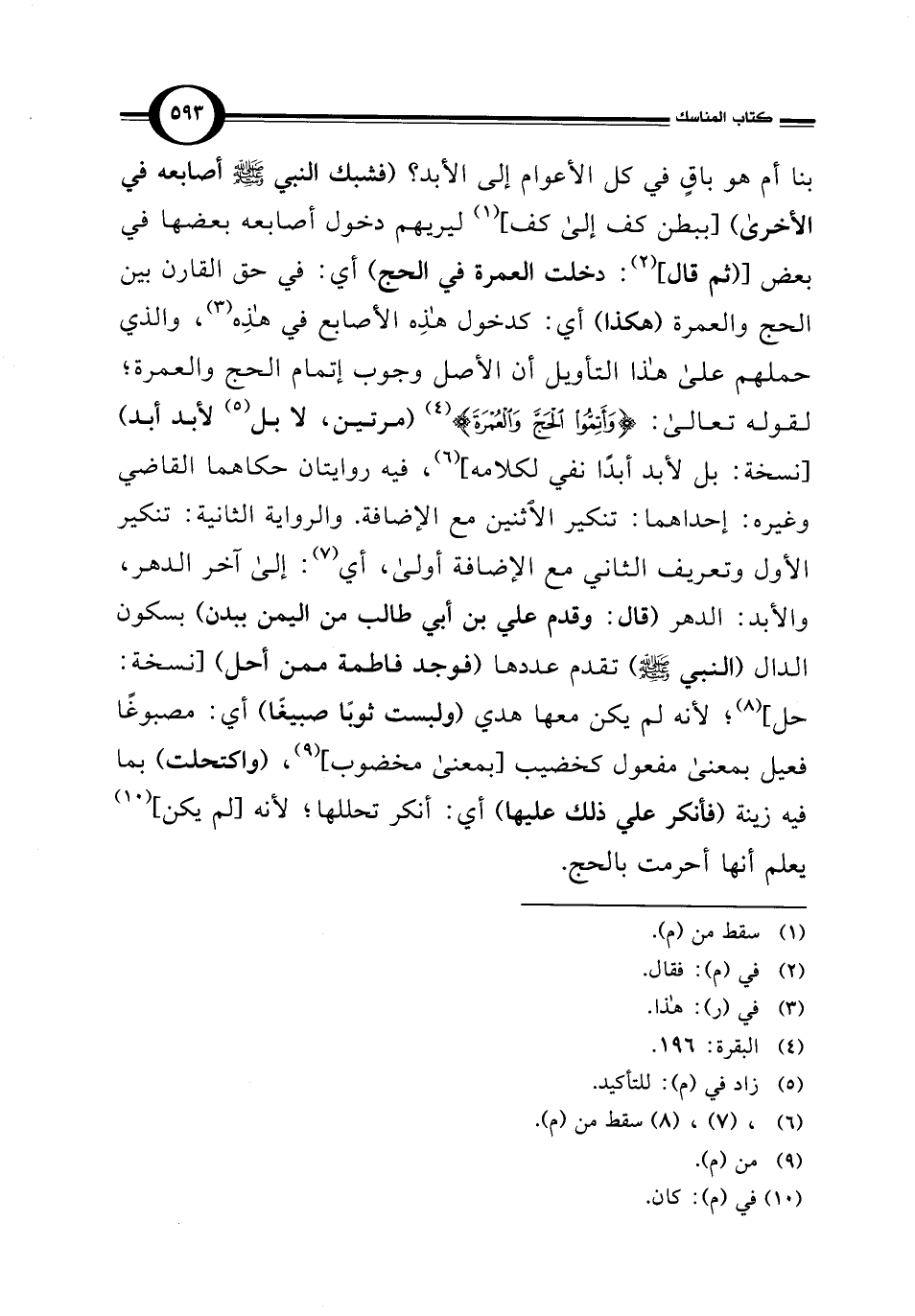بنا أم هو باقٍ في كل الأعوام إلى الأبد؟ (فشبك النبي - صلى الله عليه وسلم - أصابعه في الأخرى) [ببطن كف إلى كف] (¬1) ليريهم دخول أصابعه بعضها في بعض [(ثم قال] (¬2): دخلت العمرة في الحج) أي: في حق القارن بين الحج والعمرة (هكذا) أي: كدخول هذِه الأصابع في هذِه (¬3)، والذي حملهم على هذا التأويل أن الأصل وجوب إتمام الحج والعمرة؛ لقوله تعالى: {وَأَتِمُّوا الْحَجَّ وَالْعُمْرَةَ} (¬4) (مرتين، لا بل (¬5) لأبد أبد) [نسخة: بل لأبد أبدًا نفي لكلامه] (¬6)، فيه روايتان حكاهما القاضي وغيره: إحداهما: تنكير الاثنين مع الإضافة. والرواية الثانية: تنكير الأول وتعريف الثاني مع الإضافة أولى، أي (¬7): إلى آخر الدهر، والأبد: الدهر (قال: وقدم علي بن أبي طالب من اليمن ببدن) بسكون الدال (النبي - صلى الله عليه وسلم -) تقدم عددها (فوجد فاطمة ممن أحل) [نسخة: حل] (¬8)؛ لأنه لم يكن معها هدي (ولبست ثوبًا صبيغًا) أي: مصبوغًا فعيل بمعنى مفعول كخضيب [بمعنى مخضوب] (¬9) , (واكتحلت) بما فيه زينة (فأنكر علي ذلك عليها) أي: أنكر تحللها؛ لأنه [لم يكن] (¬10) يعلم أنها أحرمت بالحج.