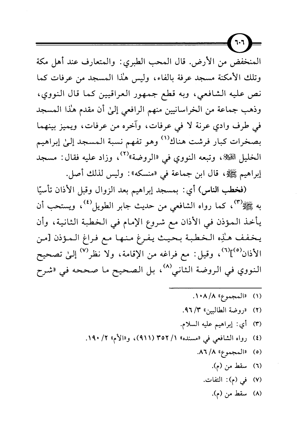 المنخفض من الأرض. قال المحب الطبري: والمتعارف عند أهل مكة وتلك الأمكنة مسجد عرفة بالفاء، وليس هذا المسجد من عرفات كما نص عليه الشافعي، وبه قطع جمهور العراقيين كما قال النووي، وذهب جماعة من الخراسانيين منهم الرافعي إلى أن مقدم هذا المسجد في طرف وادي عرنة لا في عرفات، وآخره من عرفات، ويميز بينهما بصخرات كبار فرشت هناك (¬1) وهو تفهم نسبة المسجد إلى إبراهيم الخليل - عليه السلام -، وتبعه النووي في "الروضة" (¬2)، وزاد عليه فقال: مسجد إبراهيم - صلى الله عليه وسلم -، قال ابن جماعة في "منسكه": وليس لذلك أصل.