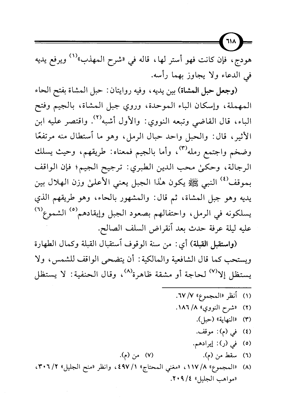 (وجعل حبل المشاة) بين يديه، وفيه روايتان: حبل المشاة بفتح الحاء المهملة، وإسكان الباء الموحدة، وروي جبل المشاة، بالجيم وفتح الباء، قال القاضي وتبعه النووي: والأول أشبه (¬2). واقتصر عليه ابن الأثير، قال: والحبل واحد حبال الرمل، وهو ما استطال منه مرتفعًا وضخم واجتمع رمله (¬3)، وأما بالجيم فمعناه: طريقهم، وحيث يسلك الرجالة، وحكى محب الدين الطبري: ترجيح الجيم؛ فإن الواقف بموقف (¬4) النبي - صلى الله عليه وسلم - يكون هذا الجبل يعني الأعلى وزن الهلال بين يديه وهو جبل المشاة، ثم قال: والمشهور بالحاء، وهو طريقهم الذي يسلكونه في الرمل، واحتفالهم بصعود الجبل وإيقادهم (¬5) الشموع (¬6) عليه ليلة عرفة حدث بعد انقراض السلف الصالح.