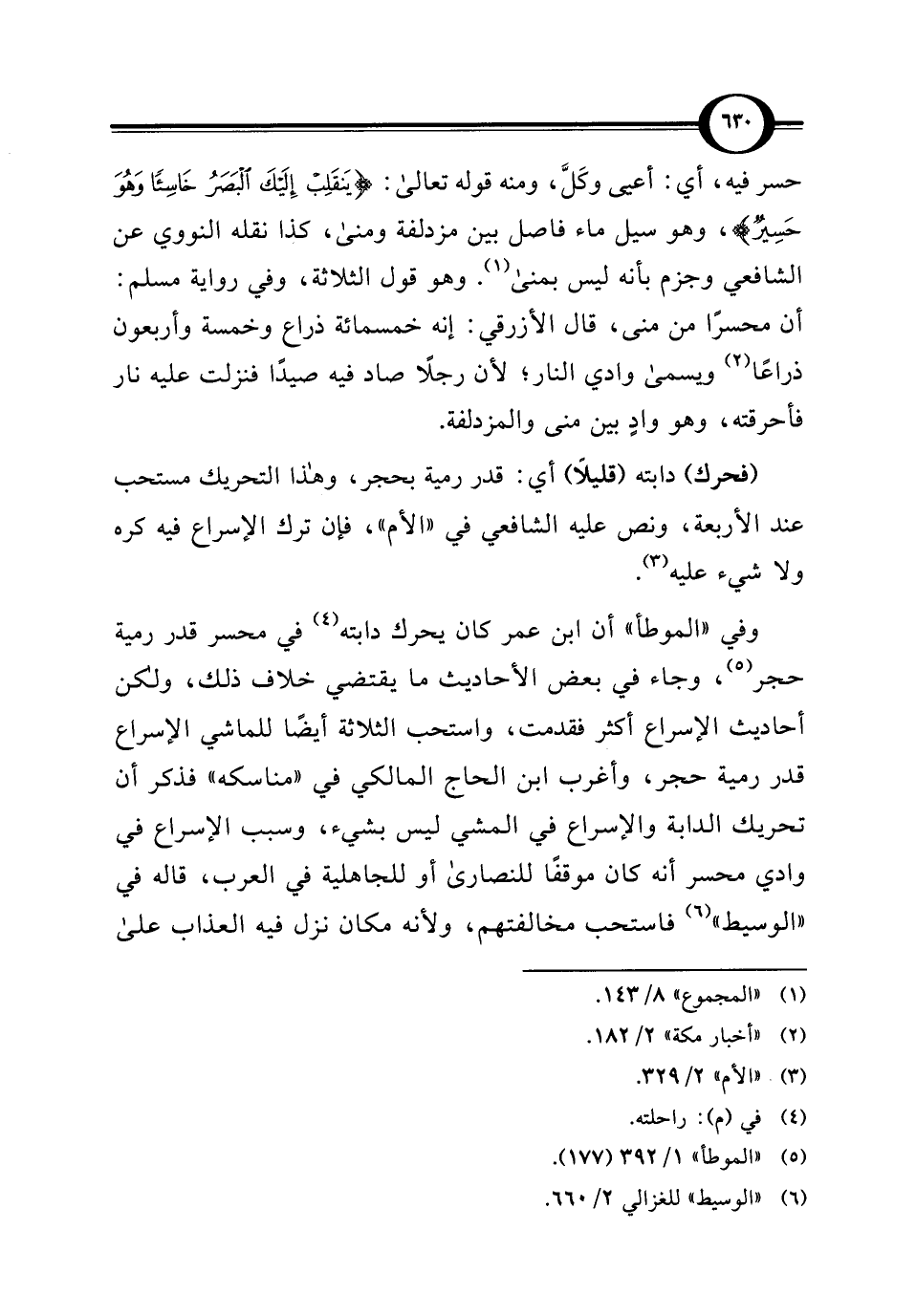 حسر فيه، أي: أعيى وكَلَّ، ومنه قوله تعالى: {يَنْقَلِبْ إِلَيْكَ الْبَصَرُ خَاسِئًا وَهُوَ حَسِيرٌ}، وهو سيل ماء فاصل بين مزدلفة ومنى، كذا نقله النووي عن الشافعي وجزم بأنه ليس بمنى (¬1). وهو قول الثلاثة، وفي رواية مسلم: أن محسرًا من منى، قال الأزرقي: إنه خمسمائة ذراع وخمسة وأربعون ذراعًا (¬2) ويسمى وادي النار؛ لأن رجلًا صاد فيه صيدًا فنزلت عليه نار فأحرقته، وهو وادٍ بين منى والمزدلفة.