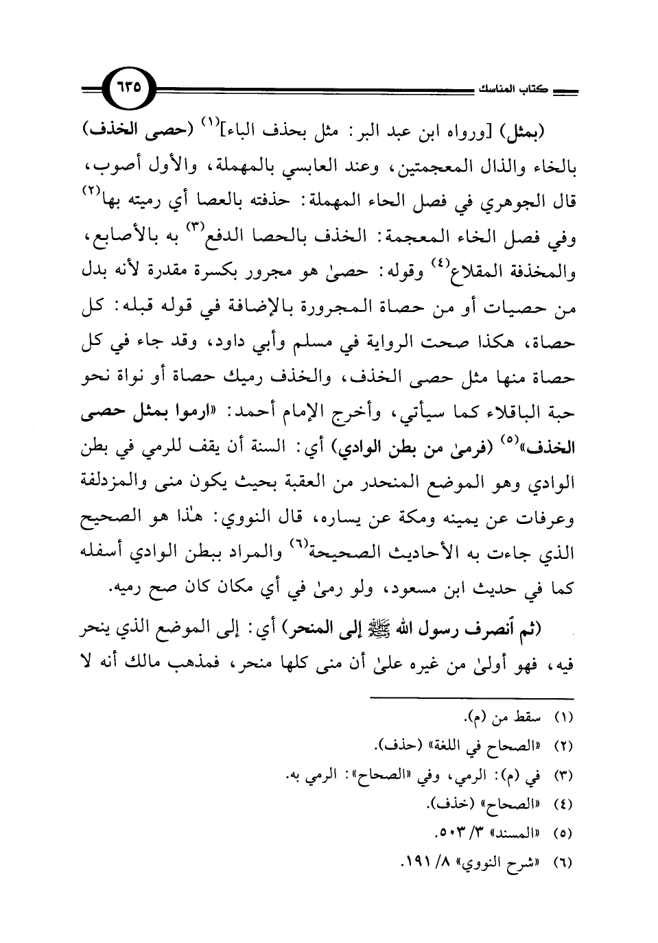 (بمثل) [ورواه ابن عبد البر: مثل بحذف الباء] (¬1) (حصى الخذف) بالخاء والذال المعجمتين، وعند العابسي بالمهملة، والأول أصوب، قال الجوهري في فصل الحاء المهملة: حذفته بالعصا أي رميته بها (¬2) وفي فصل الخاء المعجمة: الخذف بالحصا الدفع (¬3) به بالأصابع، والمخذفة المقلاع (¬4) وقوله: حصى هو مجرور بكسرة مقدرة لأنه بدل من حصيات أو من حصاة المجرورة بالإضافة في قوله قبله: كل حصاة، هكذا صحت الرواية في مسلم وأبي داود، وقد جاء في كل حصاة منها مثل حصى الخذف، والخذف رميك حصاة أو نواة نحو حبة الباقلاء كما سيأتي، وأخرج الإمام أحمد: "ارموا بمثل حصى الخذف" (¬5) (فرمى من بطن الوادي) أي: السنة أن يقف للرمي في بطن الوادي وهو الموضع المنحدر من العقبة بحيث يكون منى والمزدلفة وعرفات عن يمينه ومكة عن يساره، قال النووي: هذا هو الصحيح الذي جاءت به الأحاديث الصحيحة (¬6) والمراد ببطن الوادي أسفله كما في حديث ابن مسعود، ولو رمى في أي مكان كان صح رميه.