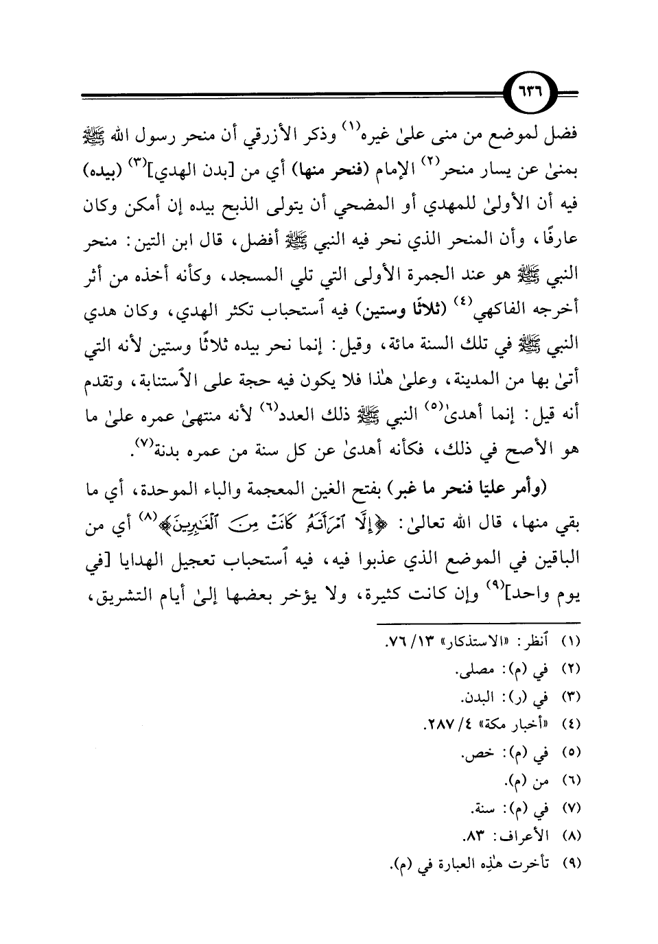 (وأمر عليّا فنحر ما غبر) بفتح الغين المعجمة والباء الموحدة، أي ما بقي منها، قال الله تعالى: {إِلَّا امْرَأَتَهُ كَانَتْ مِنَ الْغَابِرِينَ} (¬8) أي من الباقين في الموضع الذي عذبوا فيه، فيه استحباب تعجيل الهدايا [في يوم واحد] (¬9) وإن كانت كثيرة، ولا يؤخر بعضها إلى أيام التشريق،
