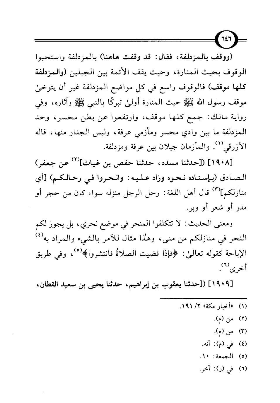 [1908] ([حدثنا مسدد، حدثنا حفص بن غياث] (¬2) عن جعفر) الصادق (بإسناده نحوه وزاد عليه: وانحروا في رحالكم) [أي منازلكم] (¬3) قال أهل اللغة: رحل الرجل منزله سواء كان من حجر أو مدر أو شعر أو وبر.