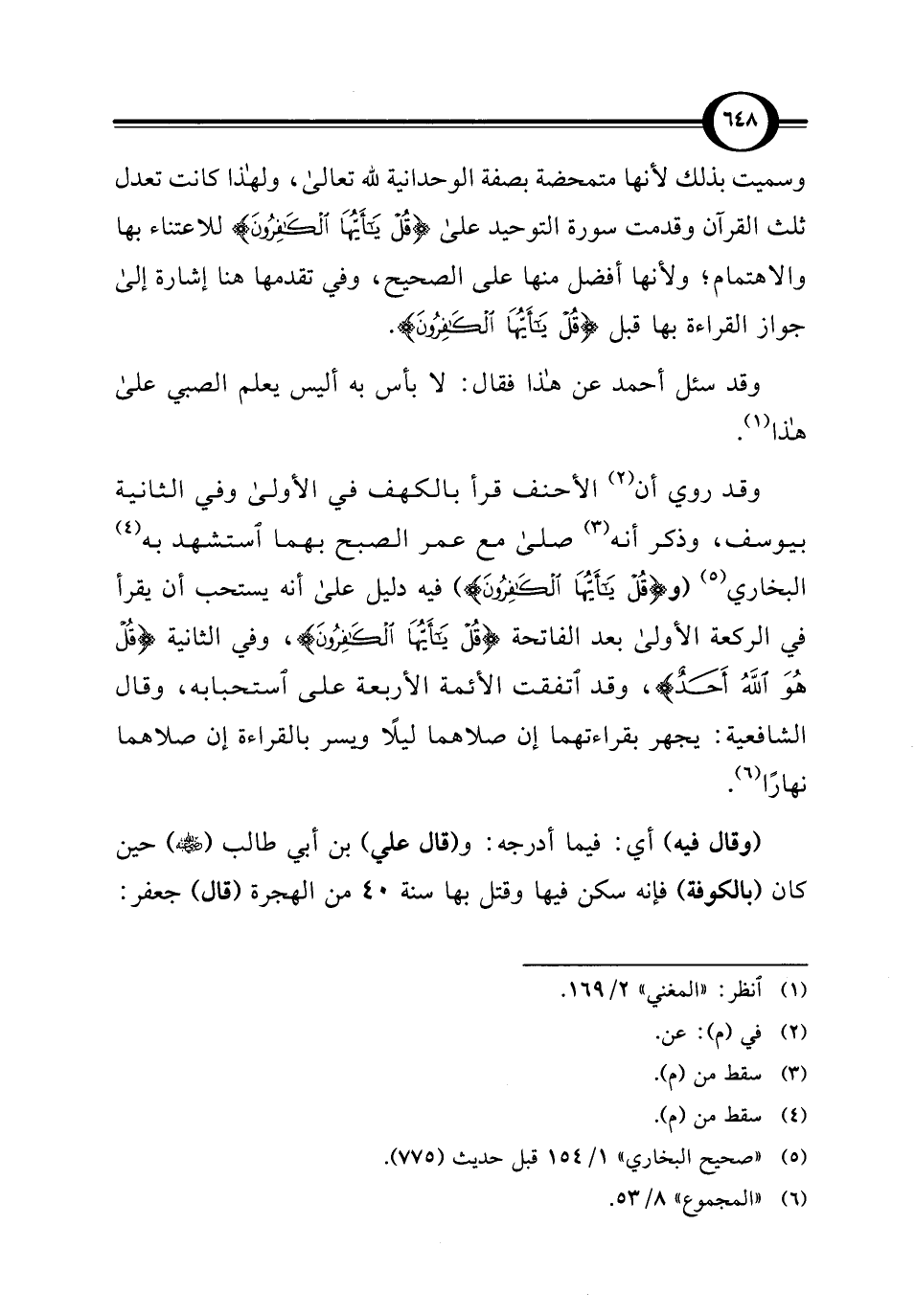 وقد روي أن (¬2) الأحنف قرأ بالكهف في الأولى وفي الثانية بيوسف، وذكر أنه (¬3) صلى مع عمر الصبح بهما استشهد به (¬4) البخاري (¬5) (و {قُلْ يَاأَيُّهَا الْكَافِرُونَ}) فيه دليل على أنه يستحب أن يقرأ في الركعة الأولى بعد الفاتحة {قُلْ يَاأَيُّهَا الْكَافِرُونَ}، وفي الثانية {قُلْ هُوَ اللَّهُ أَحَدٌ}، وقد اتفقت الأئمة الأربعة على استحبابه، وقال الشافعية: يجهر بقراءتهما إن صلاهما ليلًا ويسر بالقراءة إن صلاهما نهارًا (¬6).