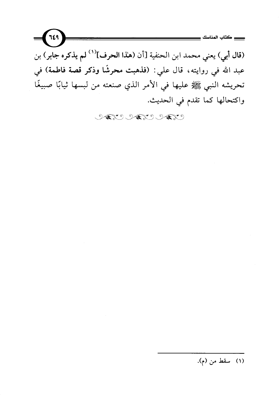 (قال أبي) يعني محمد ابن الحنفية [أن (هذا الحرف] (¬1) لم يذكره جابر) بن عبد الله في روايته، قال علي: (فذهبت محرشًا وذكر قصة فاطمة) في تحريشه النبي - صلى الله عليه وسلم - عليها في الأمر الذي صنعته من لبسها ثيابًا صبيغًا واكتحالها كما تقدم في الحديث.