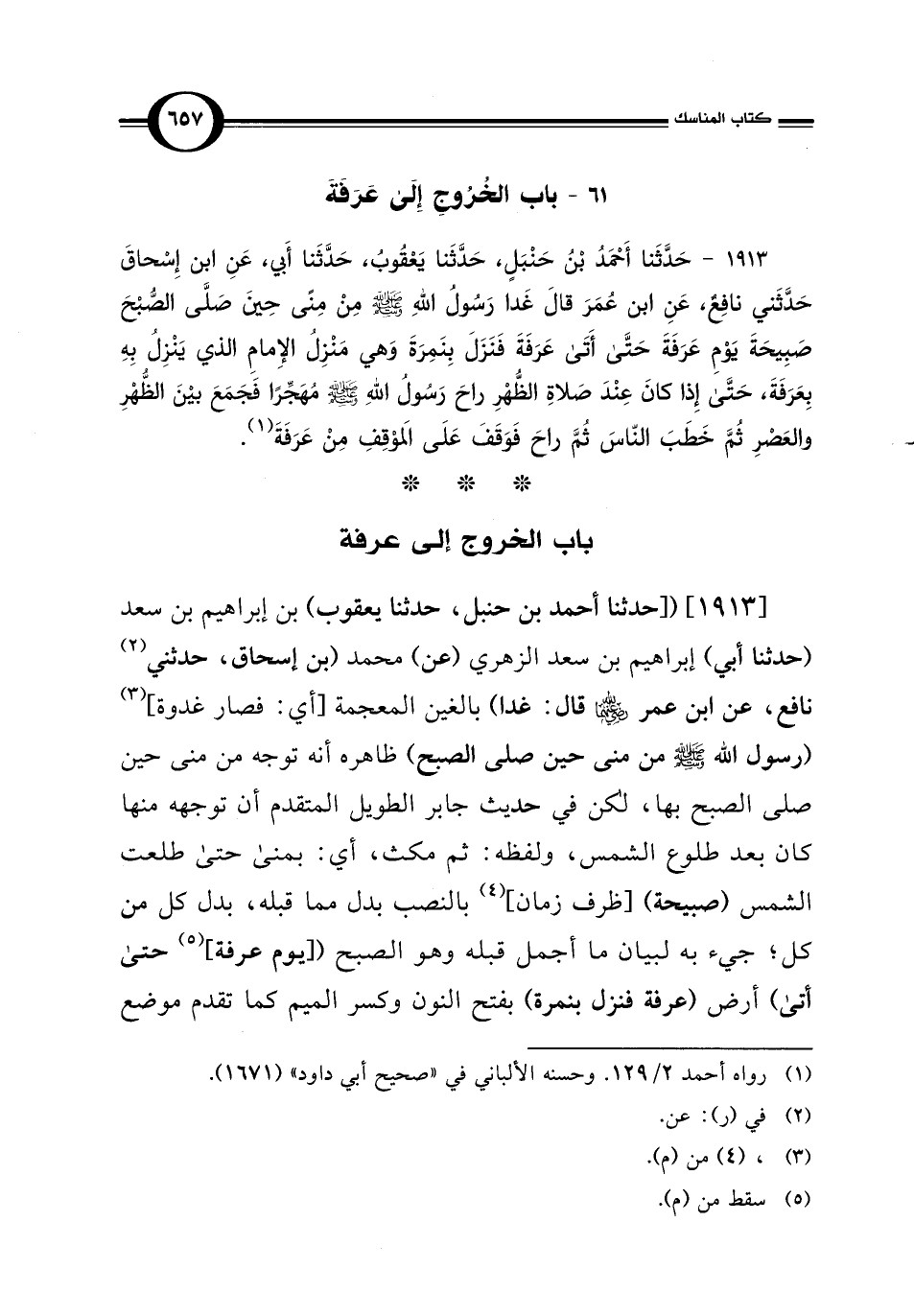 1913 - حَدَّثَنا أَحْمَدُ بْنُ حَنْبَلٍ، حَدَّثَنا يَعْقُوبُ، حَدَّثَنا أَبي، عَنِ ابن إِسْحاقَ حَدَّثَني نافِعٌ، عَنِ ابن عُمَرَ قَالَ غَدا رَسُول اللهِ - صلى الله عليه وسلم - مِنْ مِنًى حِينَ صَلَّى الصُّبْحَ صَبِيحَةَ يَوْمِ عَرَفَةَ حَتَّى أَتَى عَرَفَةَ فَنَزَلَ بِنَمِرَةَ وَهي مَنْزِلُ الإِمامِ الذي يَنْزِلُ بِهِ بِعَرَفَةَ، حَتَّى إِذَا كَانَ عِنْدَ صَلاةِ الظُّهْرِ راحَ رَسُولُ اللهِ - صلى الله عليه وسلم - مُهَجِّرًا فَجَمَعَ بَيْنَ الظُّهْرِ والعَصْرِ ثُمَّ خَطَبَ النّاسَ ثُمَّ راحَ فَوَقَفَ عَلَى المَوْقِفِ مِنْ عَرَفَةَ (¬1).