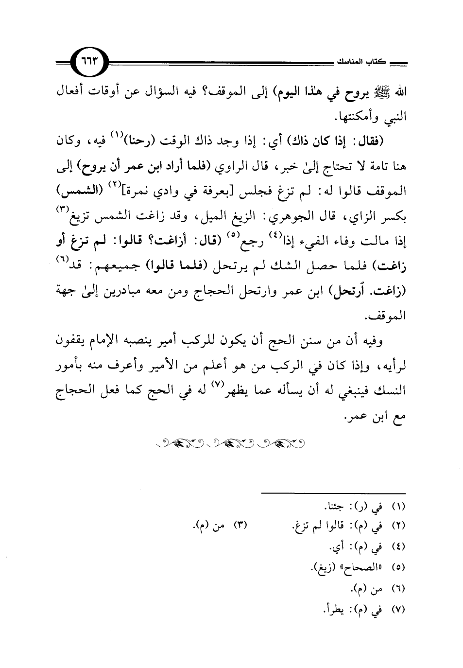 وفيه أن من سنن الحج أن يكون للركب أمير ينصبه الإمام يقفون لرأيه، وإذا كان في الركب من هو أعلم من الأمير وأعرف منه بأمور النسك فينبغي له أن يسأله عما يظهر (¬7) له في الحج كما فعل الحجاج مع ابن عمر.