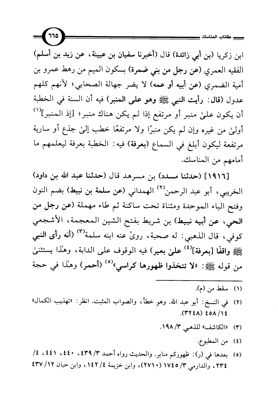 ابن زكريا (بن أبي زائدة) قال (أخبرنا سفيان بن عيينة، عن زيد بن أسلم) الفقيه العمري (عن رجل من بني ضمرة) بسكون الميم من رهط عمرو بن أمية الضمري (عن أبيه أو عمه) لا يضر جهالة الصحابي؛ لأنهم كلهم عدول (قال: رأيت النبي - صلى الله عليه وسلم - وهو على المنبر) فيه أن السنة في الخطبة أن يكون على منبر أو مرتفع إذا لم يكن هناك منبر؛ [إذ المنبر] (¬1) أولى من غيره وإن لم يكن منبرًا ولا مرتفعًا خطب إلى جذع أو سارية مرتفعة ليكون أبلغ في السماع (بعرفة) فيه: الخطبة بعرفة ليعلمهم ما أمامهم من المناسك.