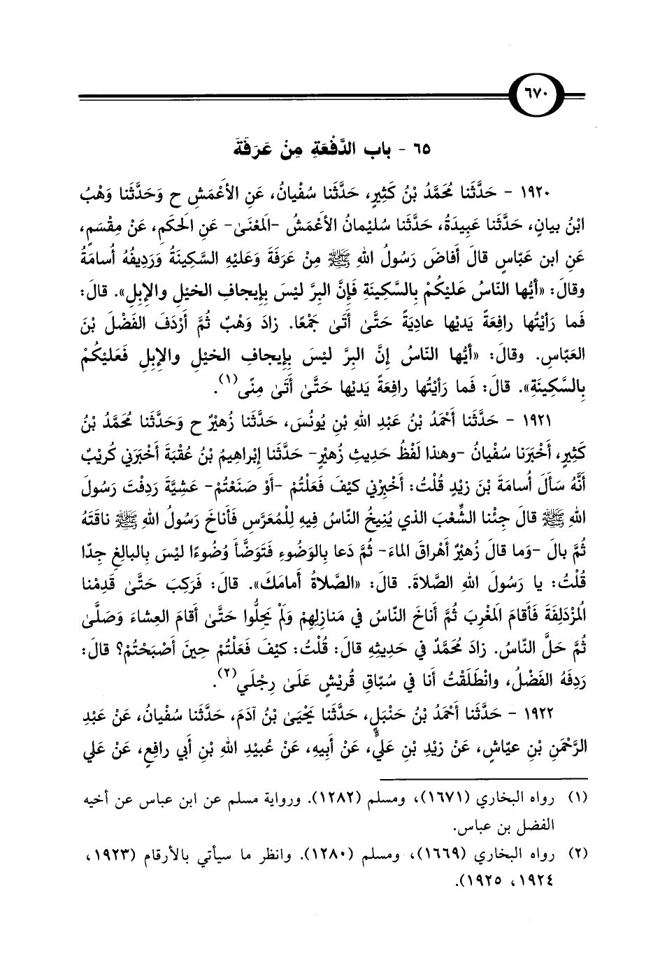 1920 - حَدَّثَنا مُحَمَّدُ بْنُ كَثِيرٍ، حَدَّثَنا سُفْيانُ، عَنِ الأَعْمَشِ ح وَحَدَّثَنا وَهْبُ بْنُ بيانٍ، حَدَّثَنا عَبِيدَةُ، حَدَّثَنا سُليْمانُ الأَعْمَشُ - المَعْنَى - عَنِ الحَكَمِ، عَنْ مِقْسَمٍ، عَنِ ابن عَبّاسٍ قَالَ أَفاضَ رَسُولُ اللهِ - صلى الله عليه وسلم - مِنْ عَرَفَةَ وَعَليْهِ السَّكِينَةُ وَرَدِيفُهُ أُسامَةُ وقَالَ: "أيُّها النّاسُ عَليْكُمْ بِالسَّكِينَةِ فَإِنَّ البِرَّ ليْسَ بِإِيجافِ الخيْلِ والإِبِلِ". قَالَ: فَما رَأيْتُها رافِعَةً يَديْها عادِيَةً حَتَّى أَتَى جَمْعًا. زادَ وَهْبٌ ثُمَّ أَرْدَفَ الفَضْلَ بْنَ العَبّاسِ. وقَالَ: "أيُّها النّاسُ إِنَّ البِرَّ ليْسَ بِإِيجافِ الخيْلِ والإِبِلِ فَعَليْكُمْ بِالسَّكِينَةِ". قَالَ: فَما رَأيْتُها رافِعَةً يَديْها حَتَّى أَتَى مِنًى (¬1).