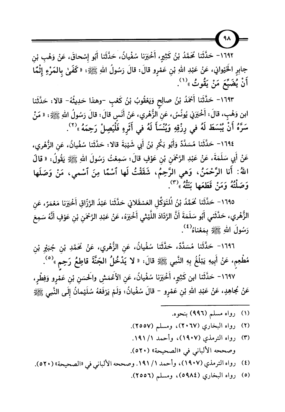 1696 - حَدَّثَنا مُسَدَّدٌ، حَدَّثَنا سُفْيانُ، عَنِ الزُّهْري، عَنْ مُحَمَّدِ بْنِ جُبَيْرِ بْنِ مُطْعِمٍ، عَنْ أَبِيهِ يَبْلُغُ بِهِ النَّبي - صلى الله عليه وسلم - قَالَ: "لا يَدْخُلُ الجَنَّةَ قاطِعُ رَحِمٍ" (¬5).