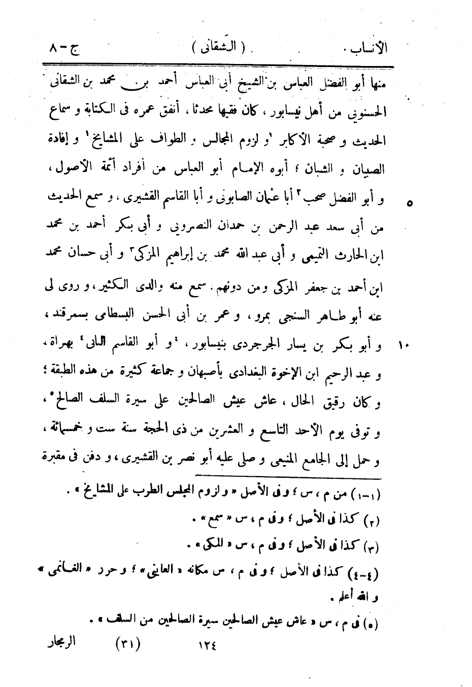 منها أبو الفضل العباس بن الشيخ أبى العباس أحمد بن محمد بن الشقاني الحسنويى من أهل نيسابور، كان فقيها محدثا، أنفق عمره في الكتابة وسماع الحديث وصحبة الأكابر [1] ولزوم المجالس والطواف على المشايخ [1] وإفادة الصبيان والشبان، أبوه الإمام أبو العباس من أفراد أئمة الأصول، وأبو الفضل صحب [2] أبا عثمان الصابوني وأبا القاسم القشيري، وسمع الحديث من أبى سعد عبد الرحمن بن حمدان النصرويى وأبى بكر أحمد بن محمد ابن الحارث التميمي وأبى عبد الله محمد بن إبراهيم المزكي [3] وأبى حسان محمد ابن أحمد بن جعفر المزكي ومن دونهم، سمع منه والدي الكثير، وروى لي عنه أبو طاهر السنجى بمرو، وعمر بن أبى الحسن البسطامي بسمرقند، وأبو بكر بن يسار الجرجردى بنيسابور، [4] وأبو القاسم الباني [؟] [4] بهراة، وعبد الرحيم ابن الإخوة البغدادي بأصبهان وجماعة كثيرة من هذه الطبقة، وكان رقيق الحال، عاش عيش الصالحين على سيرة السلف الصالح [5] ، وتوفى يوم الأحد التاسع والعشرين من ذي الحجة سنة ست وخمسمائة، وحمل إلى الجامع المنيعى وصلى عليه أبو نصر بن القشيري، ودفن في مقبرة