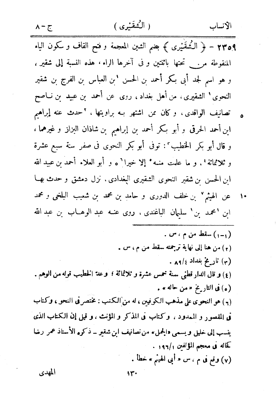 بضم الشين المعجمة وفتح القاف وسكون الياء المنقوطة من تحتها باثنتين وفي آخرها الراء، هذه النسبة إلى شقير، وهو اسم لجد أبى بكر أحمد بن الحسن [1] بن العباس بن الفرج بن شقير النحويّ [1] الشقيرى، من أهل بغداد، روى عن أحمد بن عبيد بن ناصح تصانيف الواقدي، وكان ممن اشتهر به براويتها، [2] حدث عنه إبراهيم ابن أحمد الحرقى وأبو بكر أحمد بن إبراهيم بن شاذان البزاز وغيرهما، وقال أبو بكر الخطيب [3] : توفى أبو بكر النحويّ في صفر سنة سبع عشرة وثلاثمائة [4] ، وما علمت منه [5] إلا خيرا [6] وأبو العلاء أحمد بن عبيد الله ابن الحسن بن شقير النحويّ الشقيرى البغدادي، نزل دمشق وحدث بها عن الهيثم [7] بن خلف الدوري وحامد بن محمد بن شعيب البلخي ومحمد ابن [1] محمد بن [1] سليمان الباغندي، روى عنه عبد الوهاب بن عبد الله