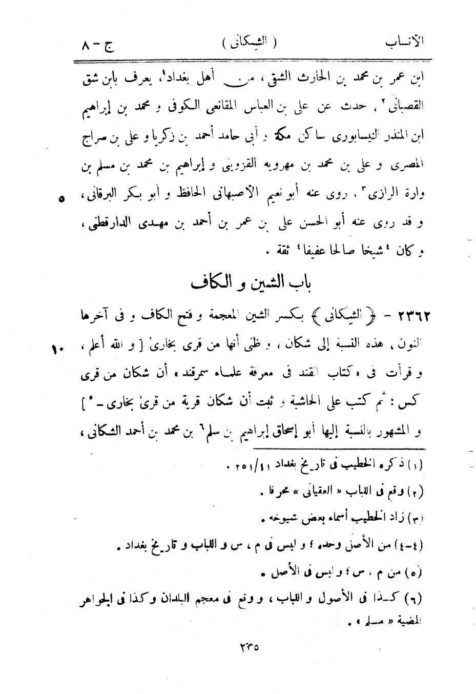 بكسر الشين المعجمة وفتح الكاف وفي آخرها النون، هذه النسبة إلى شكان، وظني أنها من قرى بخارى [والله أعلم، وقرأت في «كتاب القند في معرفة علماء سمرقند» أن شكان من قرى كس، ثم كتب على الحاشية وثبت أن شكان قرية من قرى بخارى-[5]] والمشهور بالنسبة إليها أبو إسحاق إبراهيم بن سلم [6] بن محمد بن أحمد الشكانى،