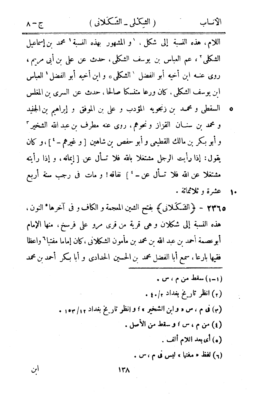 بفتح الشين المعجمة والكاف وفي آخرها [5] النون، هذه النسبة إلى شكلان وهي قرية من قرى مرو على فرسخ، منها الإمام أبو عصمة أحمد بن عبد الله بن محمد بن مأمون الشكلانى، كان إماما مفتيا [6] واعظا فقيها بارعا، سمع أبا الفضل محمد بن الحسين الحدادي وأبا بكر أحمد بن محمد