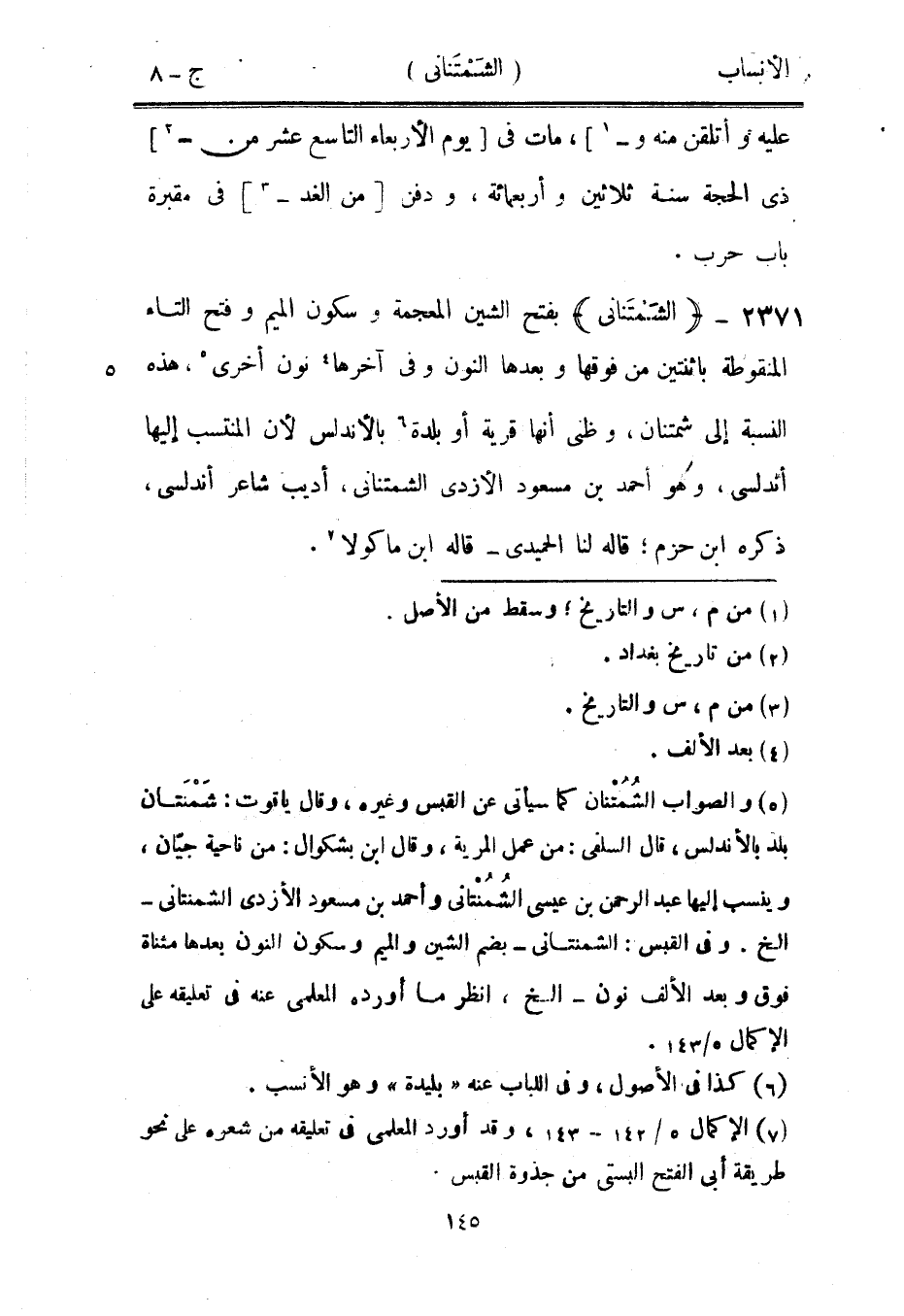 [5] والصواب الشُّمُتنان كما سيأتي عن القبس وغيره، وقال ياقوت: شَمْنَتان بلد بالأندلس، قال السلفي: من عمل المرية، وقال ابن بشكوال: من ناحية جيّان، وينسب إليها عبد الرحمن بن عيسى الشُّمُنْتاني وأحمد بن مسعود الأزدي الشمنتانى- إلخ. وفي القبس: الشمنتانى- بضم الشين والميم وسكون النون بعدها مثناة فوق وبعد الألف نون- إلخ، انظر ما أورده المعلمي عنه في تعليقه على الإكمال 5/ 143.