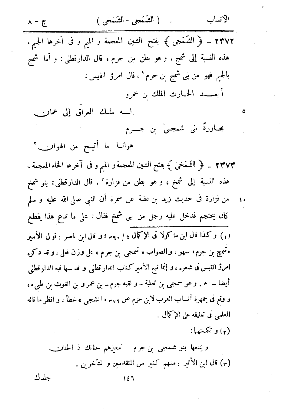 [1] وكذا قال ابن ماكولا في الإكمال 4/ 360، وقال ابن ناصر: قول الأمير «شمج بن جرم» سهو، والصواب «شمجى بن جرم» على وزن فعلى، وقد ذكره امرؤ القيس في شعره، وإنما تبع الأمير كتاب الدار قطنى وقدسها فيه الدارقطنيّ أيضا- انتهى. وهو سمجى بن ثعلبة- ولقبه جرم- بن عمرو بن الغوث بن طيِّئ، ووقع في جمهرة أنساب العرب لابن حزم ص 379 «الشجى» خطأ، وانظر ما قاله المعلمي في تعليقه على الإكمال.