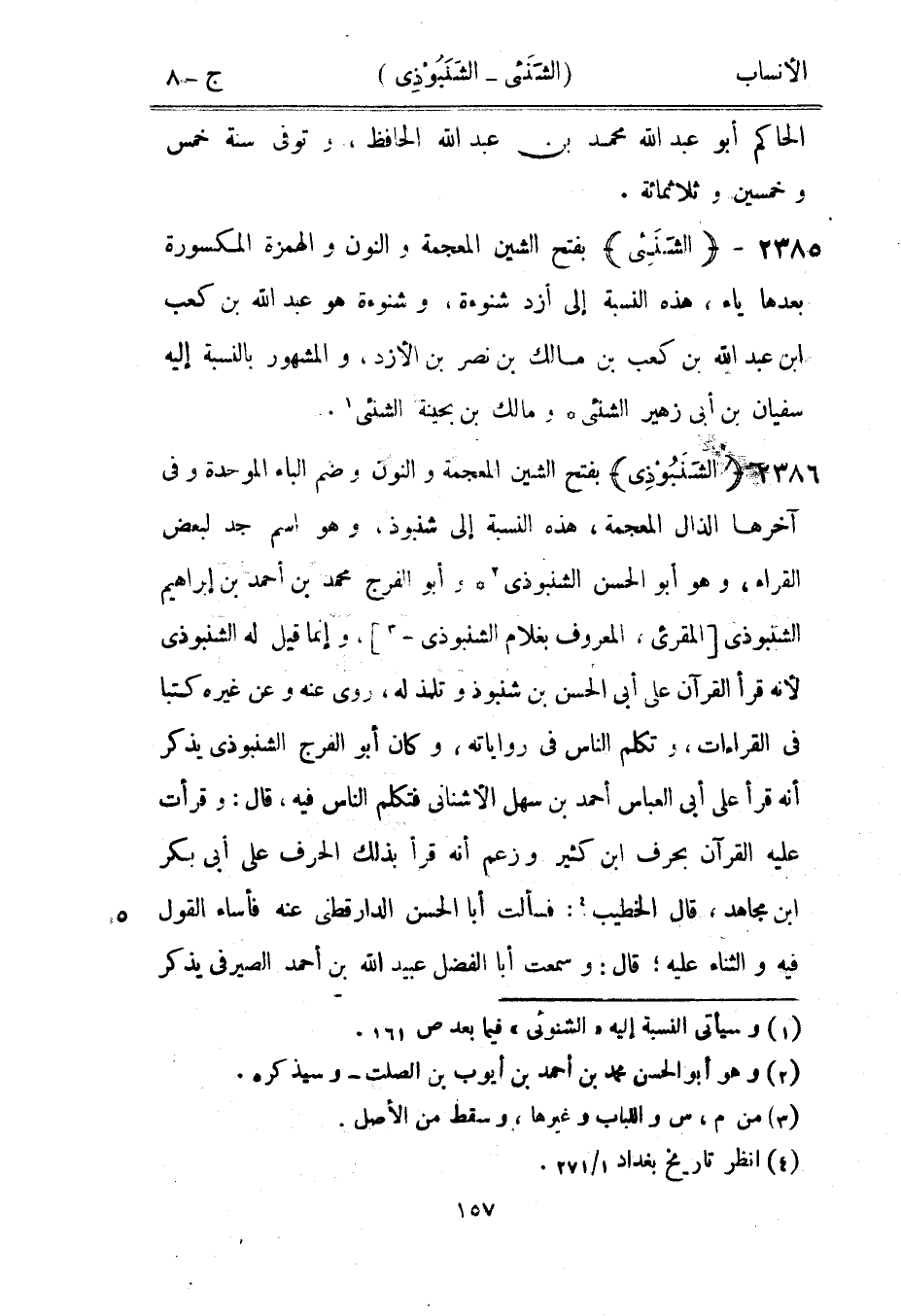 بفتح الشين المعجمة والنون وضم الباء الموحدة وفي آخرها الذال المعجمة، هذه النسبة إلى شنبوذ، وهو اسم جد لبعض القراء، وهو أبو الحسن الشنبوذى [2] وأبو الفرج محمد بن أحمد بن إبراهيم الشنبوذى [المقرئ، المعروف بغلام الشنبوذى-[3]] ، وإنما قيل له الشنبوذى لأنه قرأ القرآن على أبى الحسن بن شنبوذ وتلمذ له، روى عنه وعن غيره كتبا في القراءات، وتكلم الناس في رواياته، وكان أبو الفرج الشنبوذى يذكر أنه قرأ على أبى العباس أحمد بن سهل الأشناني فتكلم الناس فيه، قال: وقرأت عليه القرآن بحرف ابن كثير وزعم أنه قرأ بذلك الحرف على أبى بكر ابن مجاهد، قال الخطيب [4] : فسألت أبا الحسن الدار قطنى عنه فأساء القول فيه والثناء عليه، قال: وسمعت أبا الفضل عبيد الله بن أحمد الصيرفي يذكر