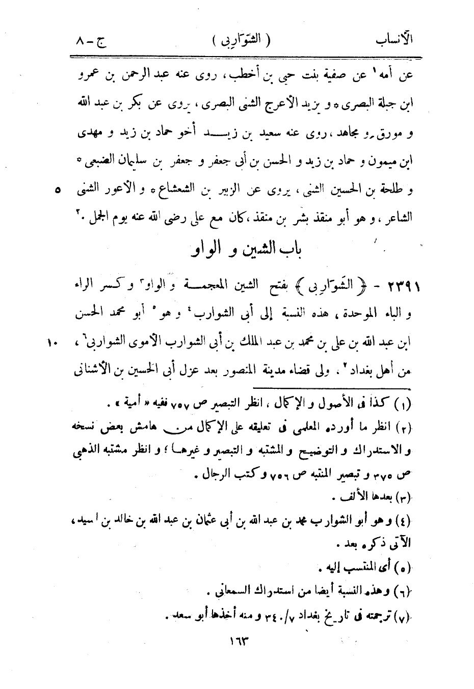 بفتح الشين المعجمة والواو [3] وكسر الراء والباء الموحدة، هذه النسبة إلى أبى الشوارب [4] وهو [5] أبو محمد الحسن ابن عبد الله بن على بن محمد بن عبد الملك بن أبى الشوارب الأموي الشواربى [6] ، من أهل بغداد [7] ، ولى قضاء مدينة المنصور بعد عزل أبى الحسين بن الأشناني