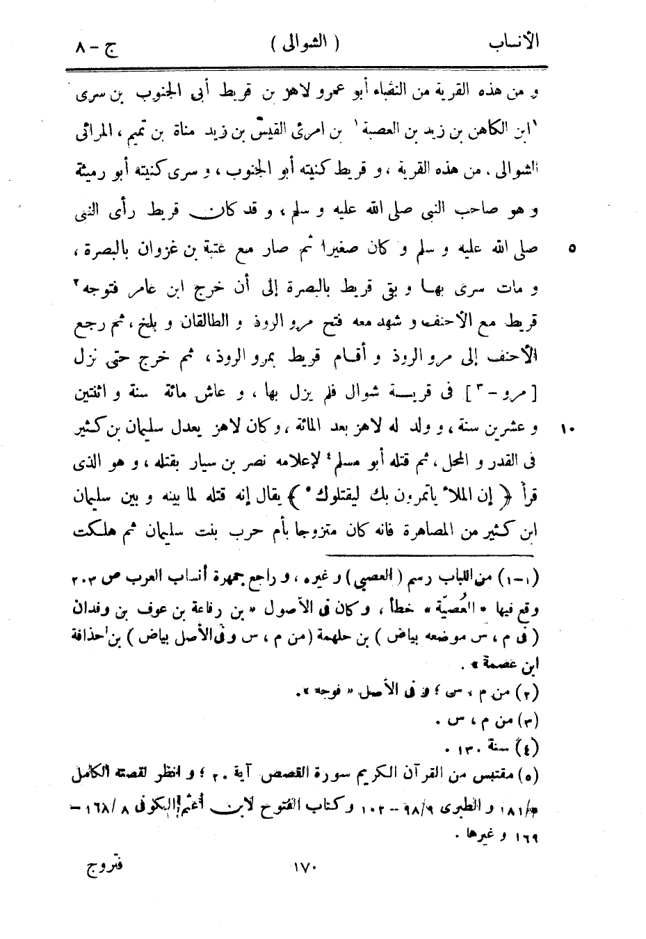 ومن هذه القرية من النقباء أبو عمرو لاهز بن قريط أبى الجنوب بن سرى [1] ابن الكاهن بن زيد بن العصبة [1] بن امرئ القيس بن زيد مناة بن تميم، المرائي الشوالي، من هذه القرية، وقريط كنيته أبو الجنوب، وسرى كنيته أبو رميثة وهو صاحب النبي صلى الله عليه وسلم، وقد كان قريط رأى النبي صلى الله عليه وسلم وكان صغيرا ثم صار مع عتبة بن غزوان بالبصرة، ومات سرى بها وبقي قريط بالبصرة إلى أن خرج ابن عامر فتوجه [2] قريط مع الأحنف وشهد معه فتح مروالروذ والطالقان وبلخ، ثم رجع الأحنف إلى مروالروذ وأقام قريط بمروالروذ، ثم خرج حتى نزل [مرو-[3]] في قرية شوال فلم يزل بها، وعاش مائة سنة واثنتين وعشرين سنة، وولد له لاهز بعد المائة، وكان لاهز يعدل سليمان بن كثير في القدر والمحل، ثم قتله أبو مسلم [4] لإعلامه نصر بن سيار بقتله، وهو الّذي قرأ إِنَّ الْمَلَأَ يَأْتَمِرُونَ بِكَ لِيَقْتُلُوكَ [5] 28: 20 يقال إنه قتله لما بينه وبين سليمان ابن كثير من المصاهرة فإنه كان متزوجا بأم حرب بنت سليمان ثم هلكت
