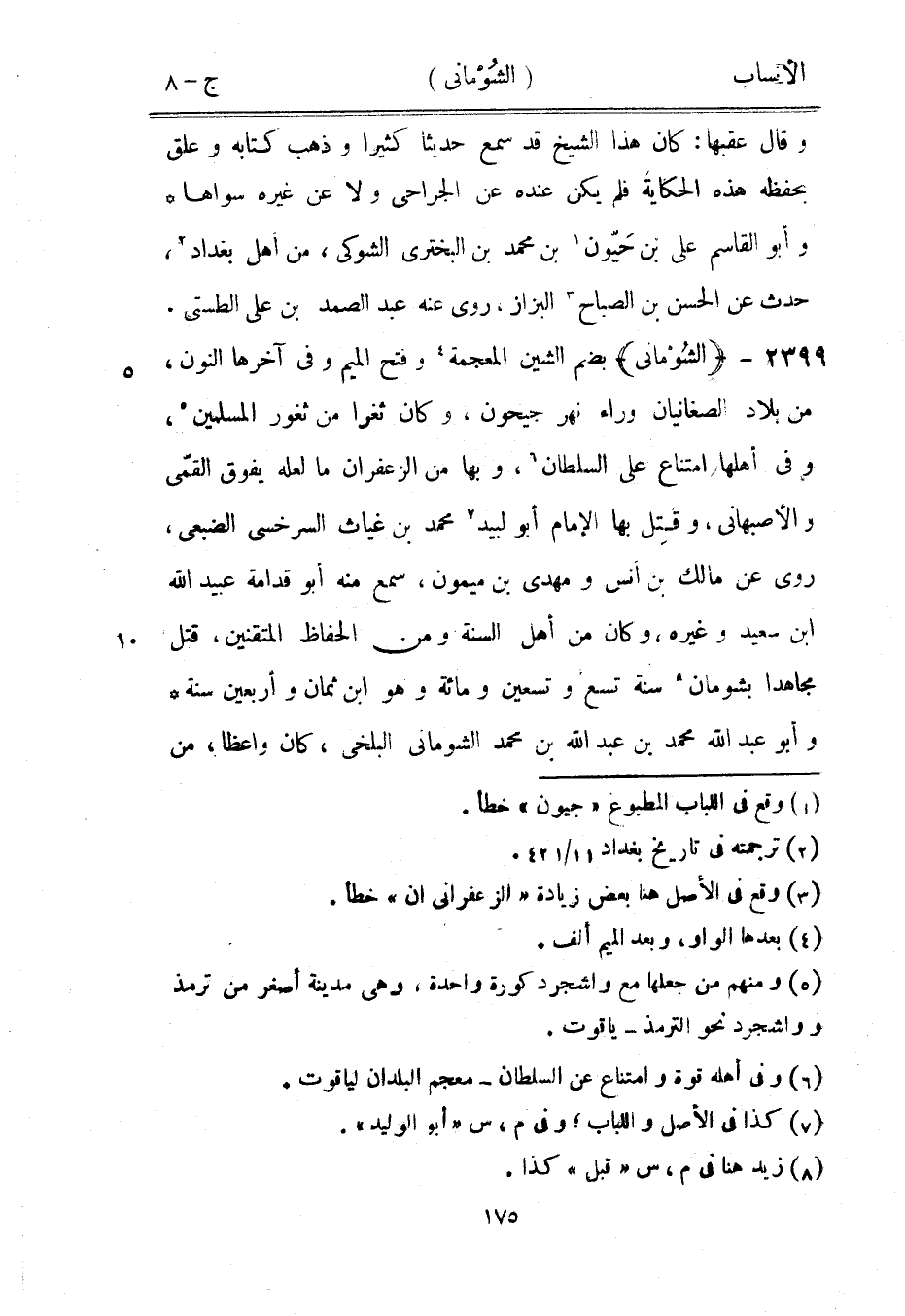 بضم الشين المعجمة [4] وفتح الميم وفي آخرها النون، من بلاد الصغانيان وراء نهر جيحون، وكان ثغرا من ثغور المسلمين [5] ، وفي أهلها امتناع على السلطان [6] ، وبها من الزعفران ما لعله يفوق القمّي والأصبهاني، وقتل بها الإمام أبو لبيد [7] محمد بن غياث السرخسي الضبعي، روى عن مالك بن أنس ومهدي بن ميمون، سمع منه أبو قدامة عبيد الله ابن سعيد وغيره، وكان من أهل السنة ومن الحفاظ المتقنين، قتل مجاهدا بشومان [8] سنة تسع وتسعين ومائة وهو ابن ثمان وأربعين سنة وأبو عبد الله محمد بن عبد الله بن محمد الشومانى البلخي، كان واعظا، من