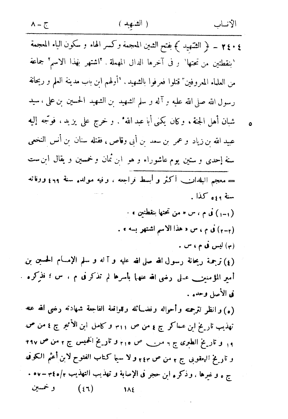 بفتح الشين المعجمة وكسر الهاء وسكون الياء المعجمة [1] بنقطتين من تحتها [1] وفي آخرها الدال المهملة. [2] اشتهر بهذا الاسم [2] جماعة من العلماء المعروفين [3] قتلوا فعرفوا بالشهيد، [4] أولهم ابن باب مدينة العلم وريحانة رسول الله صلى الله عليه وآله وسلم الشهيد بن الشهيد الحسين بن على، سيد شبان أهل الجنة، وكان يكنى أبا عبد الله [5] ، وخرج على يزيد، فوجّه إليه عبيد الله بن زياد وعمر بن سعد بن أبى وقاص، فقتله سنان بن أنس النخعي سنة إحدى وستين يوم عاشوراء وهو ابن ثمان وخمسين ويقال ابن ست