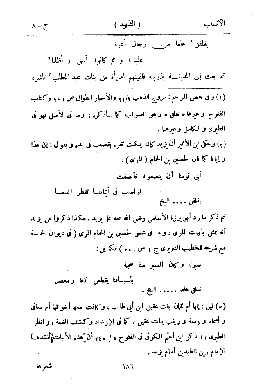 [3] قيل: إنها أم لقمان بنت عقيل ابن أبى طالب، وكانت معها أخواتها أم معافى وأسماء ورملة وزينب بنات عقيل، كما في الإرشاد وكشف الغمة، وانظر الطبري، وذكر ابن أعثم الكوفي في الفتوح 5/ 245 أن هذه الأبيات أنشدها الإمام زين العابدين أمام يزيد.