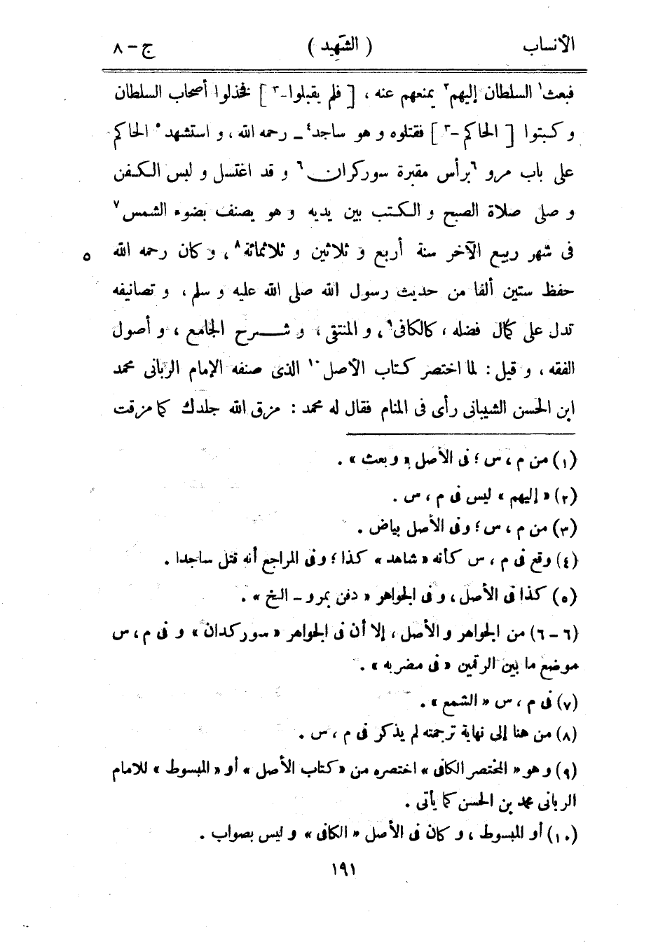 فبعث [1] السلطان إليهم [2] يمنعهم عنه، [فلم يقبلوا-[3]] فخذلوا أصحاب السلطان وكبتوا [الحاكم-[3]] فقتلوه وهو ساجد [4]- رحمه الله، واستشهد [5] الحاكم على باب مرو [6] برأس مقبرة سوركران [6] وقد اغتسل ولبس الكفن وصلى صلاة الصبح والكتب بين يديه وهو يصنف بضوء الشمس [7] في شهر ربيع الآخر سنة أربع وثلاثين وثلاثمائة [8] ، وكان رحمه الله حفظ ستين ألفا من حديث رسول الله صلى الله عليه وسلم، وتصانيفه تدل على كمال فضله، كالكافي [9] ، والمنتقى، وشرح الجامع، وأصول الفقه، وقيل: لما اختصر كتاب الأصل [10] الّذي صنفه الإمام الرباني محمد ابن الحسن الشيباني رأى في المنام فقال له محمد: مزق الله جلدك كما مزقت