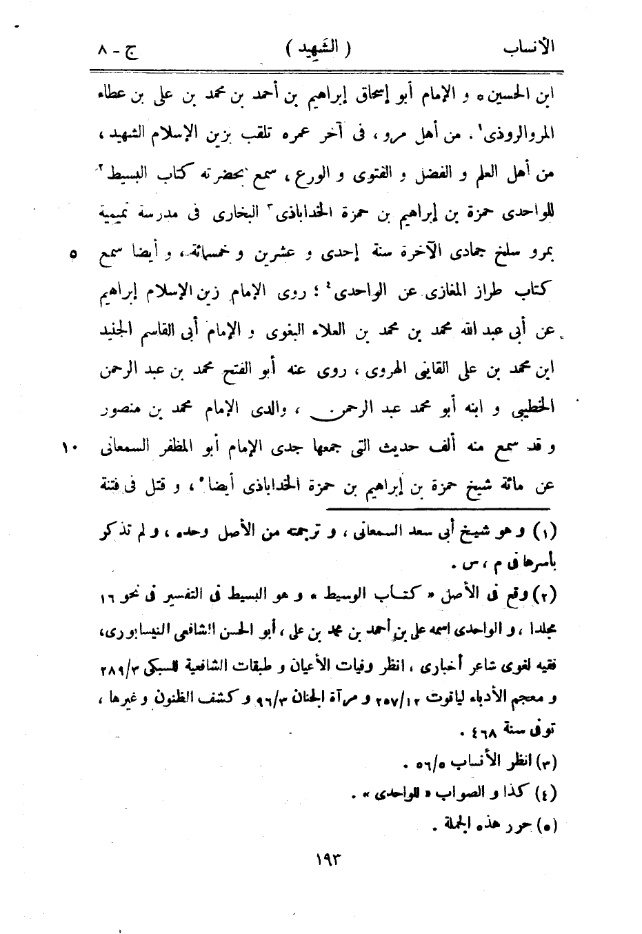 ابن الحسين والإمام أبو إسحاق إبراهيم بن أحمد بن محمد بن على بن عطاء المروالروذي [1] ، من أهل مرو، في آخر عمره تلقب بزين الإسلام الشهيد، من أهل العلم والفضل والفتوى والورع، سمع بحضرته كتاب البسيط [2] للواحدي حمزة بن إبراهيم بن حمزة الخداباذى [3] البخاري في مدرسة تميمية بمرو سلخ جمادى الآخرة سنة إحدى وعشرين وخمسمائة، وأيضا سمع كتاب طراز المغازي عن الواحدي [4] ، روى الإمام زين الإسلام إبراهيم عن أبى عبد الله محمد بن محمد بن العلاء البغوي والإمام أبى القاسم الجنيد ابن محمد بن على القائني الهروي، روى عنه أبو الفتح محمد بن عبد الرحمن الخطيبيّ وابنه أبو محمد عبد الرحمن، والدي الإمام محمد بن منصور وقد سمع منه ألف حديث التي جمعها جدي الإمام أبو المظفر السمعاني عن مائة شيخ حمزة بن إبراهيم بن حمزة الخداباذى أيضا [5] ، وقتل في فتنة