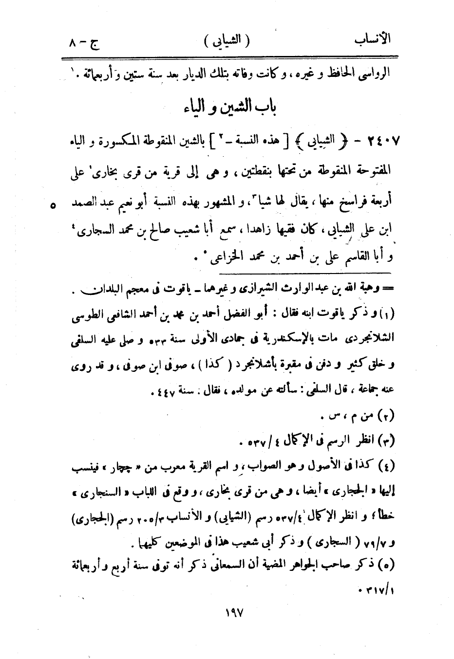 [هذه النسبة-[2]] بالشين المنقوطة المكسورة والياء المفتوحة المنقوطة من تحتها بنقطتين، وهي إلى قرية من قرى بخارى على أربعة فراسخ منها، يقال لها شيا [3] ، والمشهور بهذه النسبة أبو نعيم عبد الصمد ابن على الشيايى، كان فقيها زاهدا، سمع أبا شعيب صالح بن محمد السجارى [4] وأبا القاسم على بن أحمد بن محمد الخزاعي [5] .