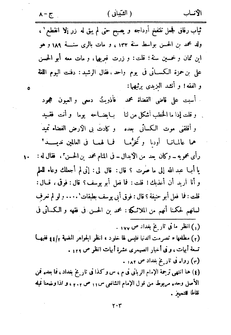 [4] هنا انتهى ترجمة الإمام الرباني في م، س وكذا في تاريخ بغداد، فما بعده فمن الأصل وحده مربوط من قول الإمام الشافعيّ س 11 ص 202، ولذا وضعنا قبله نقاطا التمييز.